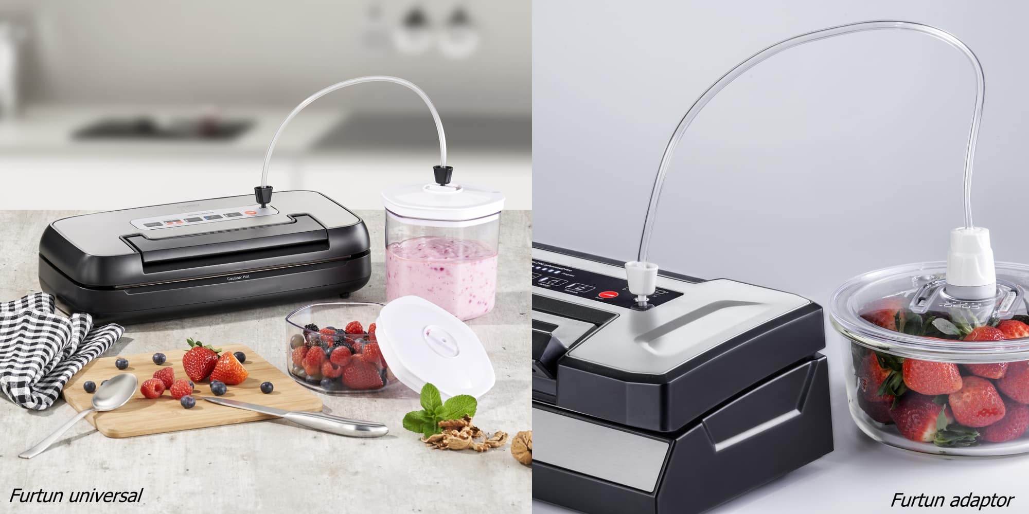 În funcție de caserolele achiziționate puteți utiliza furtunul universal care este inclus în pachetul anumitor aparate de vidat. Caserolele VacuBoxx și VacuBoxx Eco au nevoie de furtunul adaptor pentru a fi utilizat împreuna cu aparatul de vidat.