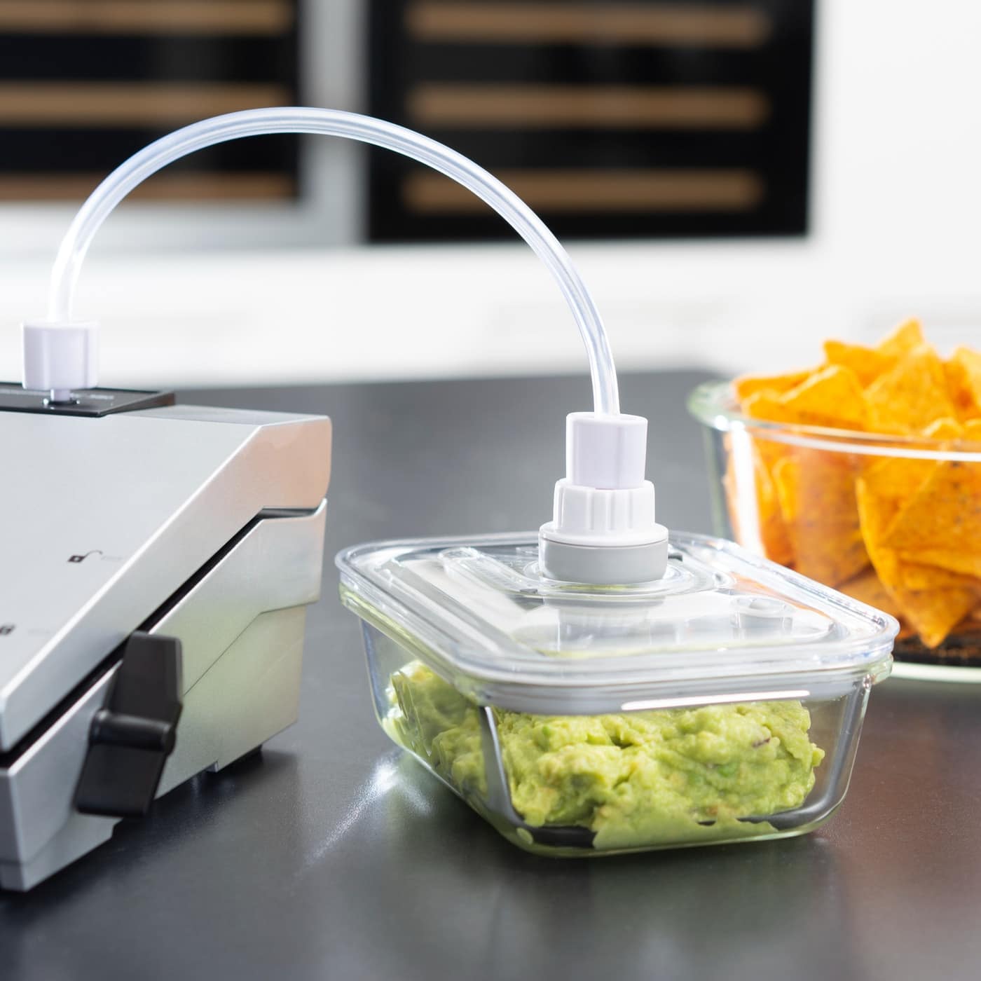 Pentru a vida alimentele în caserole veți avea nevoie de un furtun adaptor (dacă folosiți un aparat de vidat) sau de pompa de vidat.