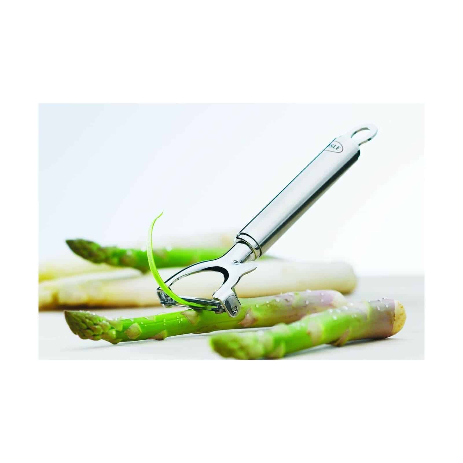 Forma dispozitivului pentru curatat ajuta la taierea fasiilor subtiri de castravete, morcovi sau dovlecei chiar daca legumele au coaja mai groasa. Este dotat cu un punct ascutit pentru a scoate petele de pe legume.