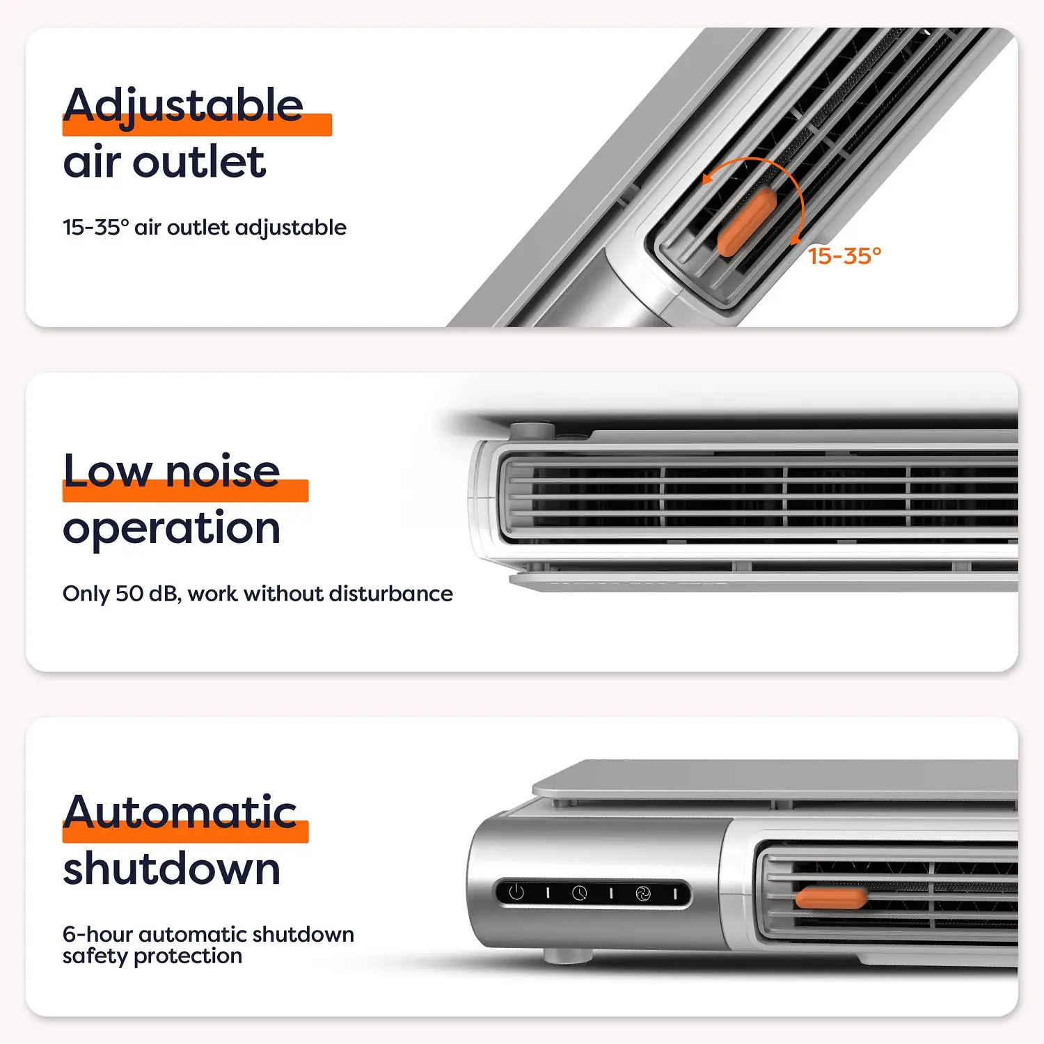 Panoul de control tactil este extrem de intuitiv, permitandu-ti sa setezi intre cele 3 viteze de operare, aer cald sau ventilatie. Mai mult, aparatul se opreste dupa 6 ore de functionare.