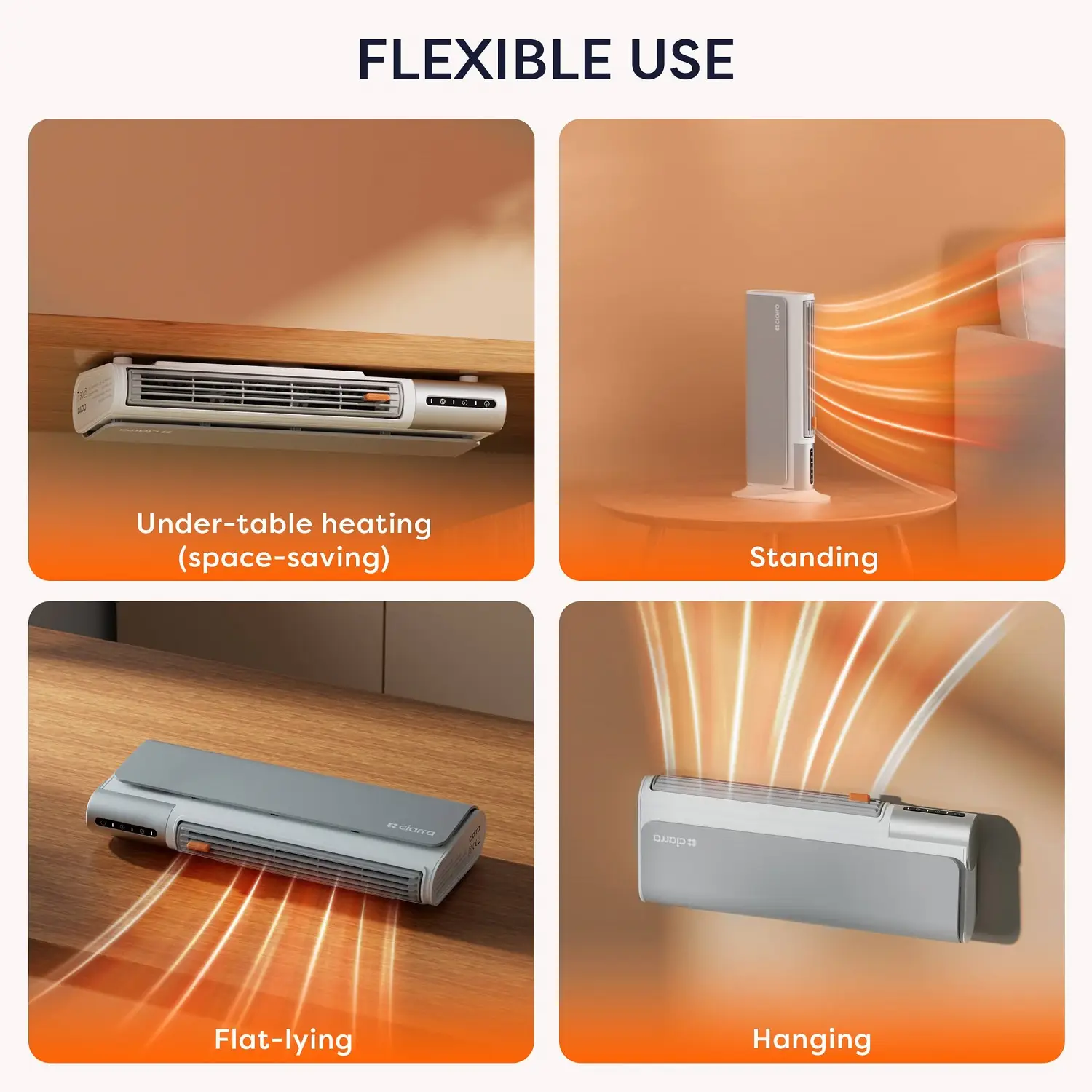Aparatul emite aer cald spre utilizator, dar este dotat si cu functia de ventilatie, oferind o briza placuta in zilele calduroase.