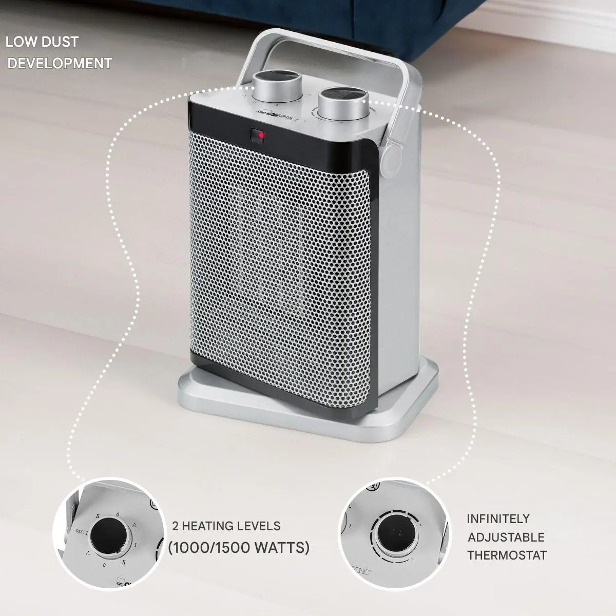 Cu doua trepte de putere, aeroterma Clatronic sporeste confortul in locuinta ta, astfel ca poti sa te bucuri de caldura uniforma in doar cateva secunde. Datorita termostatului ajustabil, iti poti personaliza ambientul si ai control precis asupra temperaturii. Invarte butonul si bucura-te de cele mai calduroase momente!