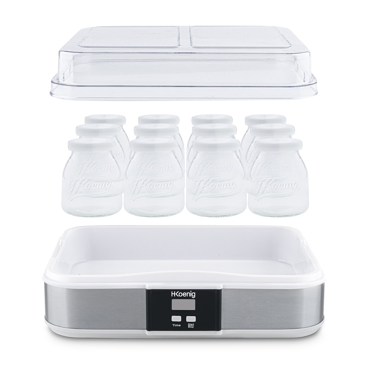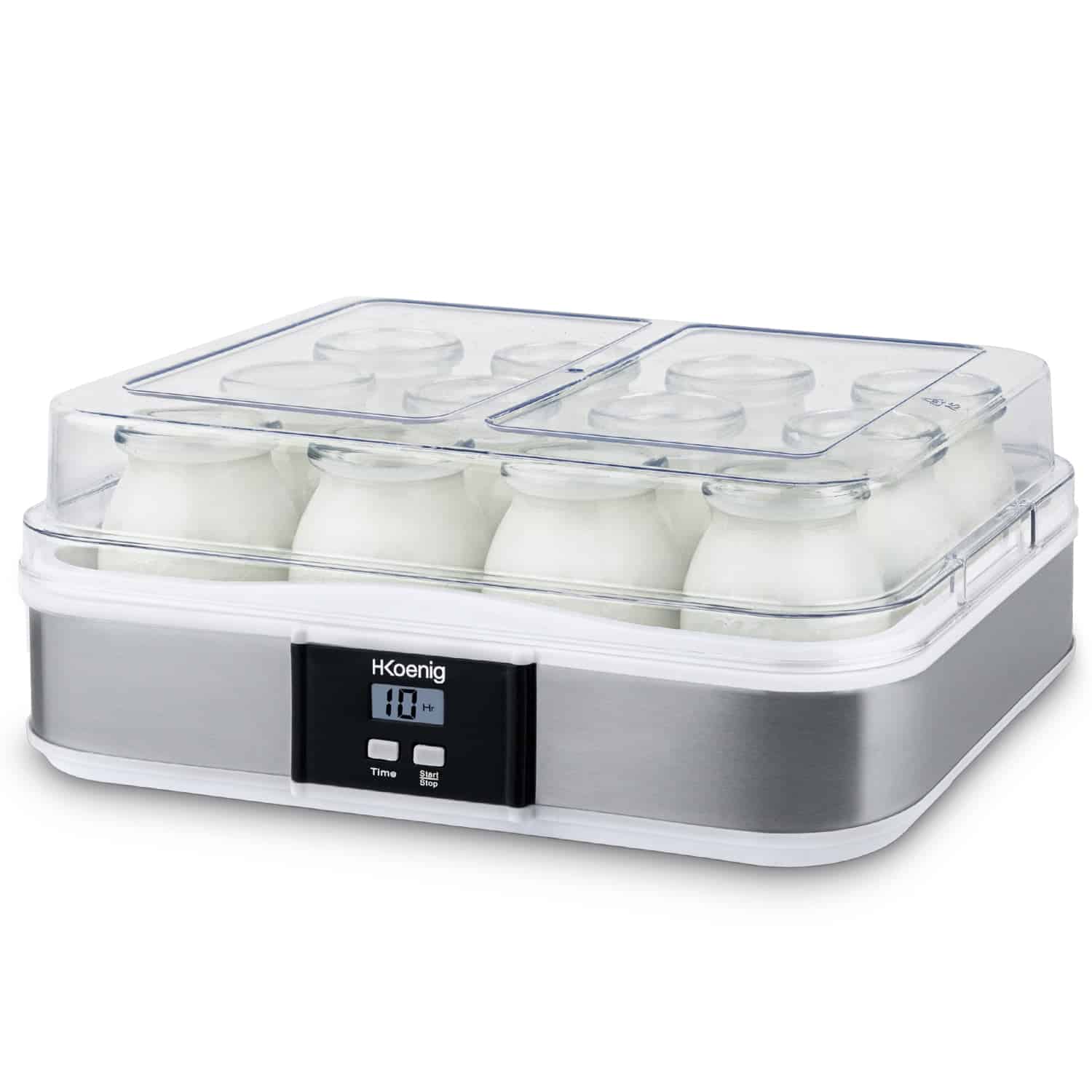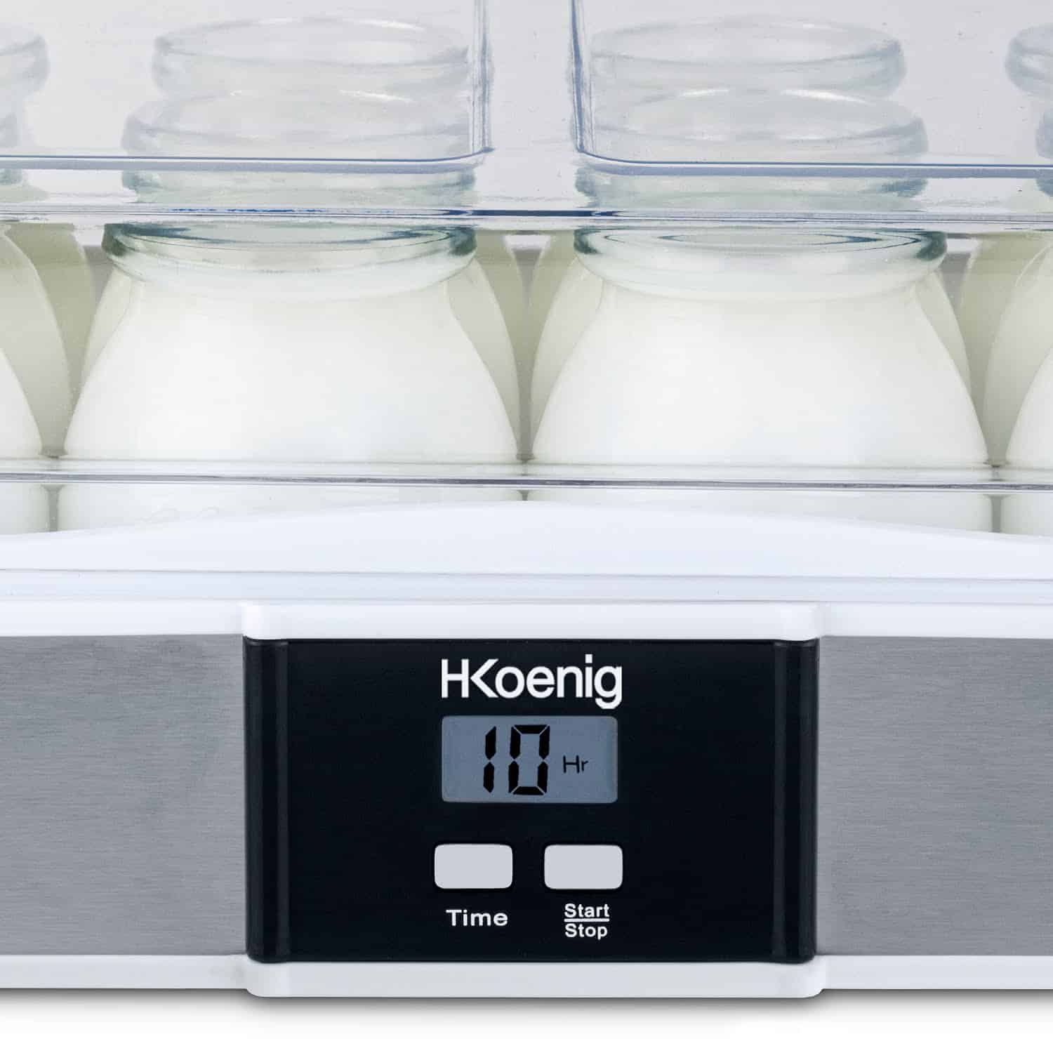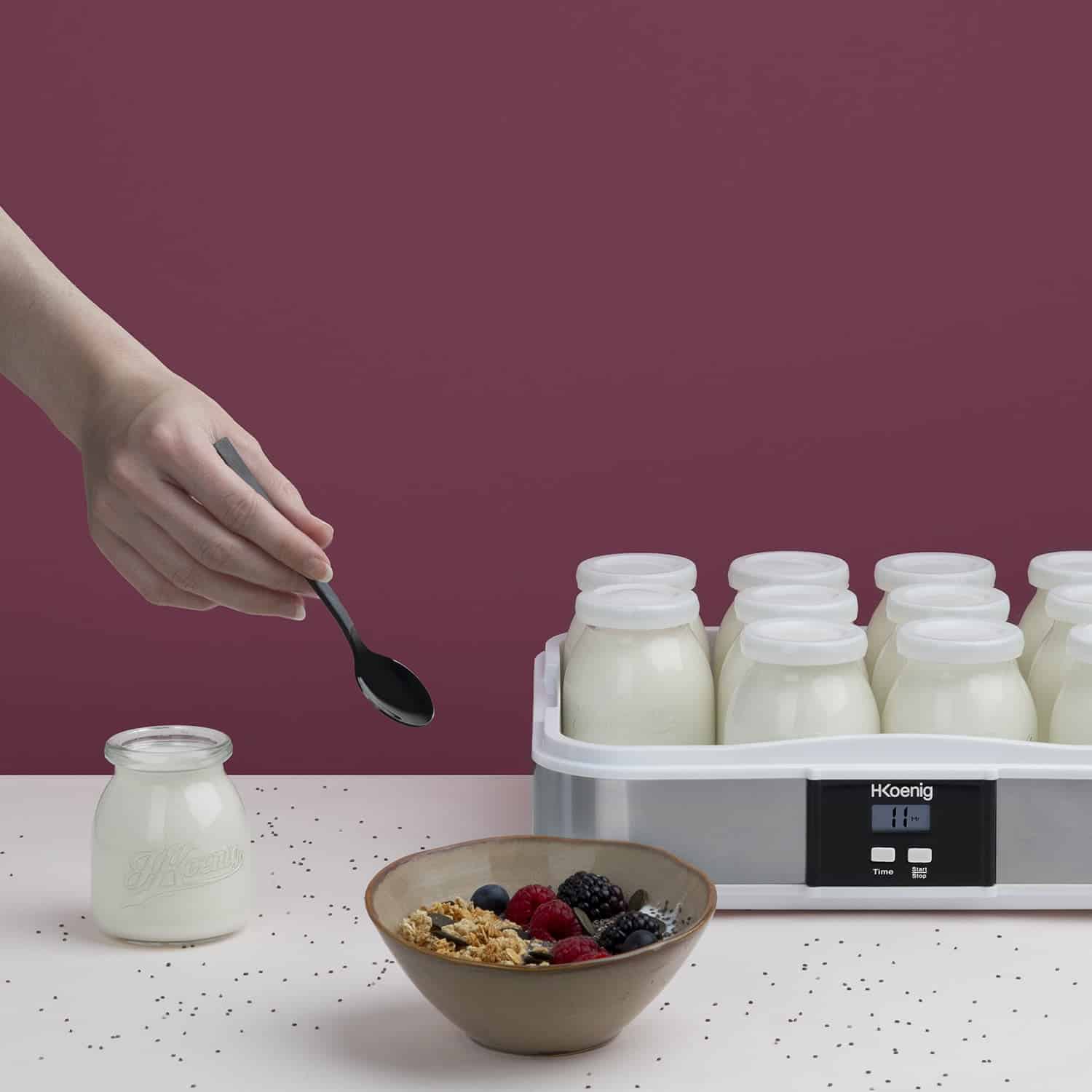 Aparatul de preparat iaurt ELY120 de la H.Koenig este ideal pentru pregatirea unui iaurt sanatos, gustos si cel mai important – fara conservanti. Aparatul de preparat iaurt contine 12 borcane din sticla, fiecare a cate 160 ml, acest lucru insemnand peste 2 litri de iaurt gatit, pentru ca fiecare membru al familiei sa se bucure de o portie de iaurt proaspat. Serviti iaurtul cu gem, cereale, bucati de ciocolata, seminte sau fructe.