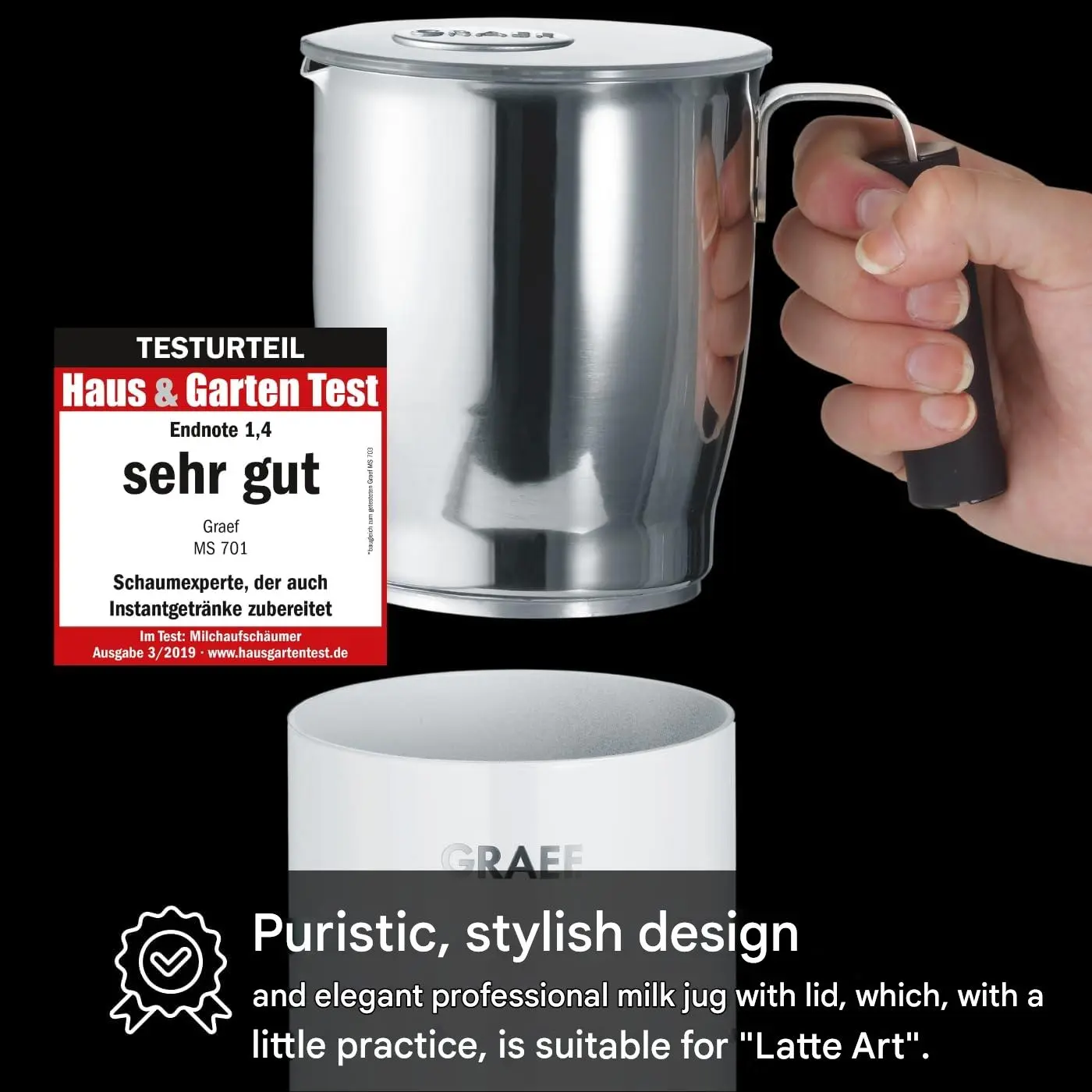 Cu aparatul de spumare a laptelui Graef MS701 veti obtine o cafea la fel de delicioasa ca si cea facuta de un barista cu experienta – indiferent daca e vorba de cappuccino, cafea cu lapte, sau ciocolata calda.