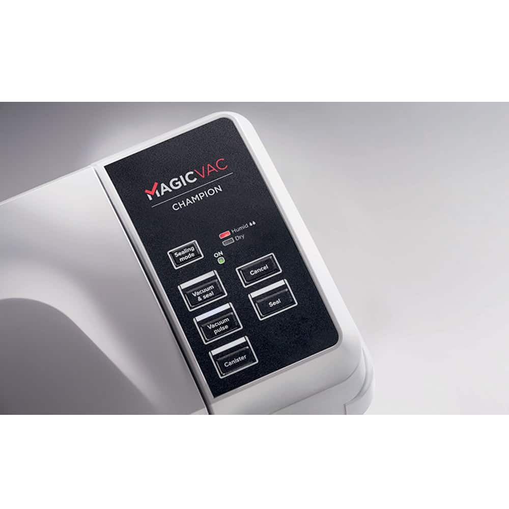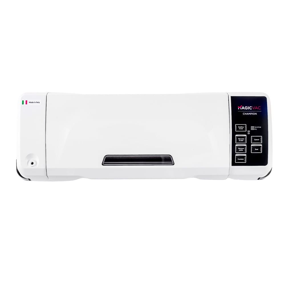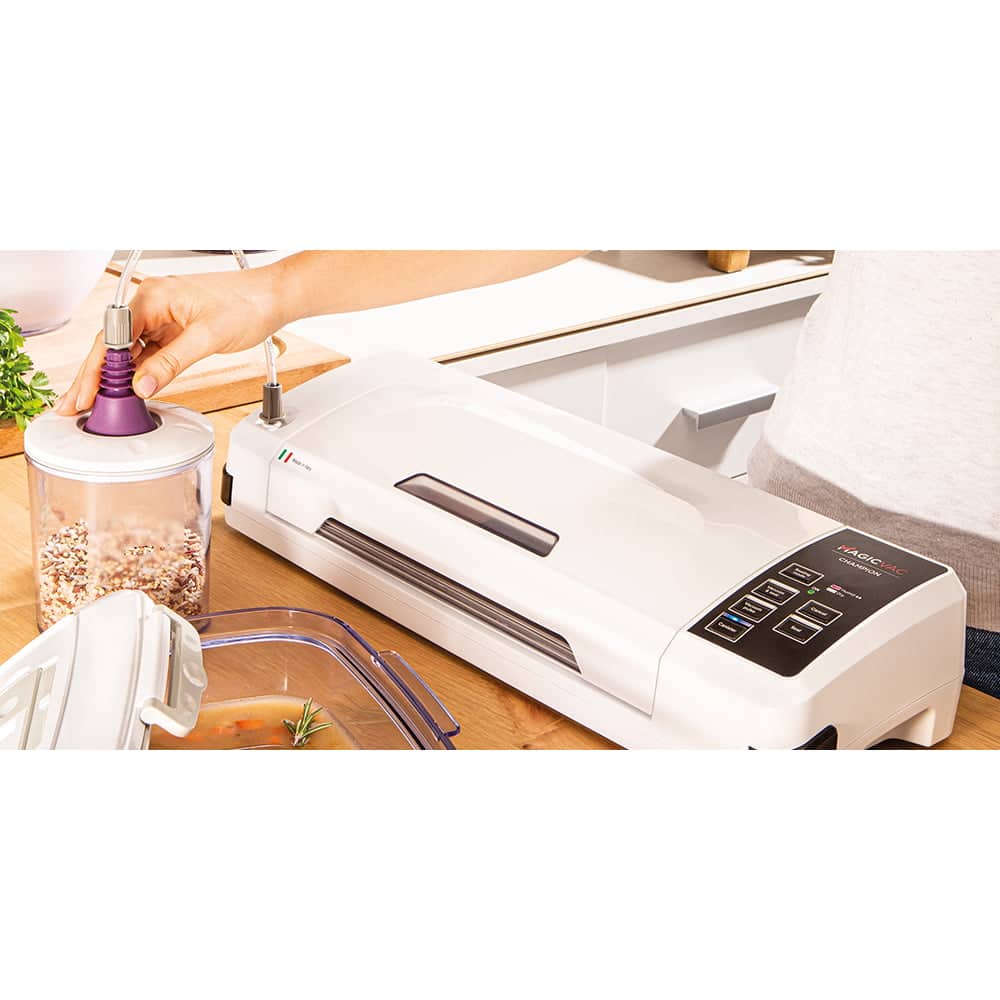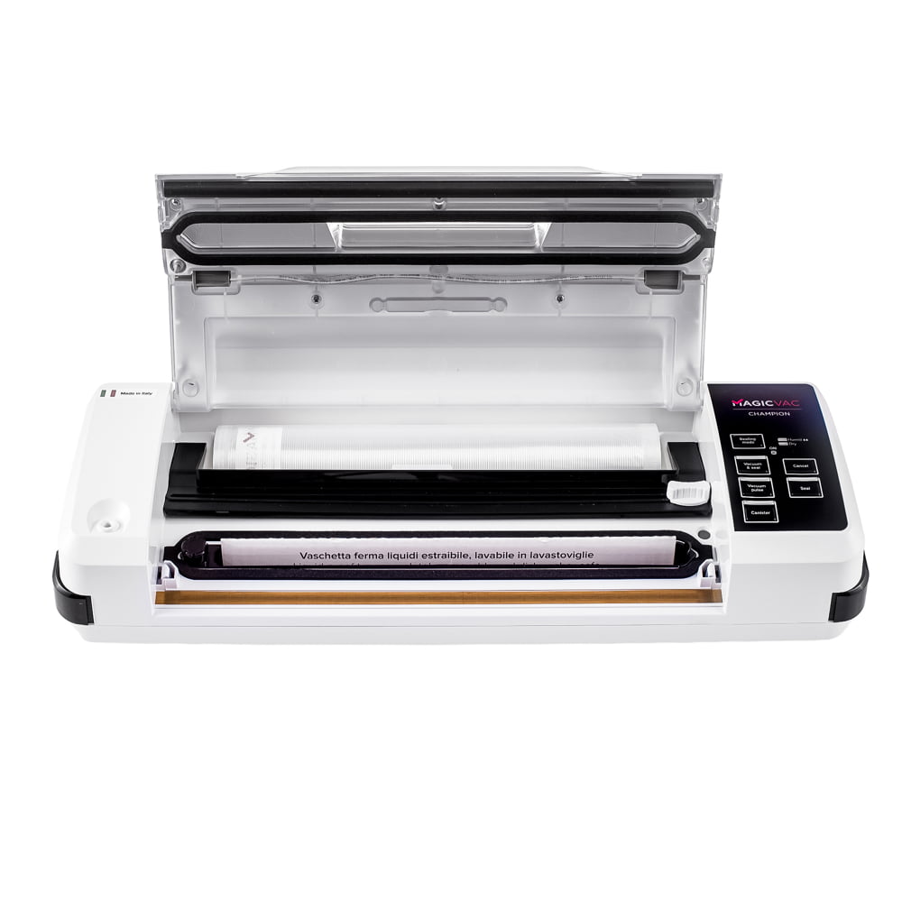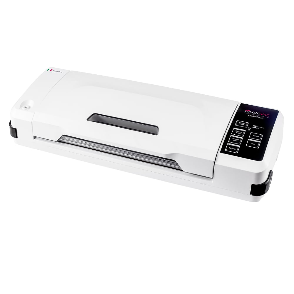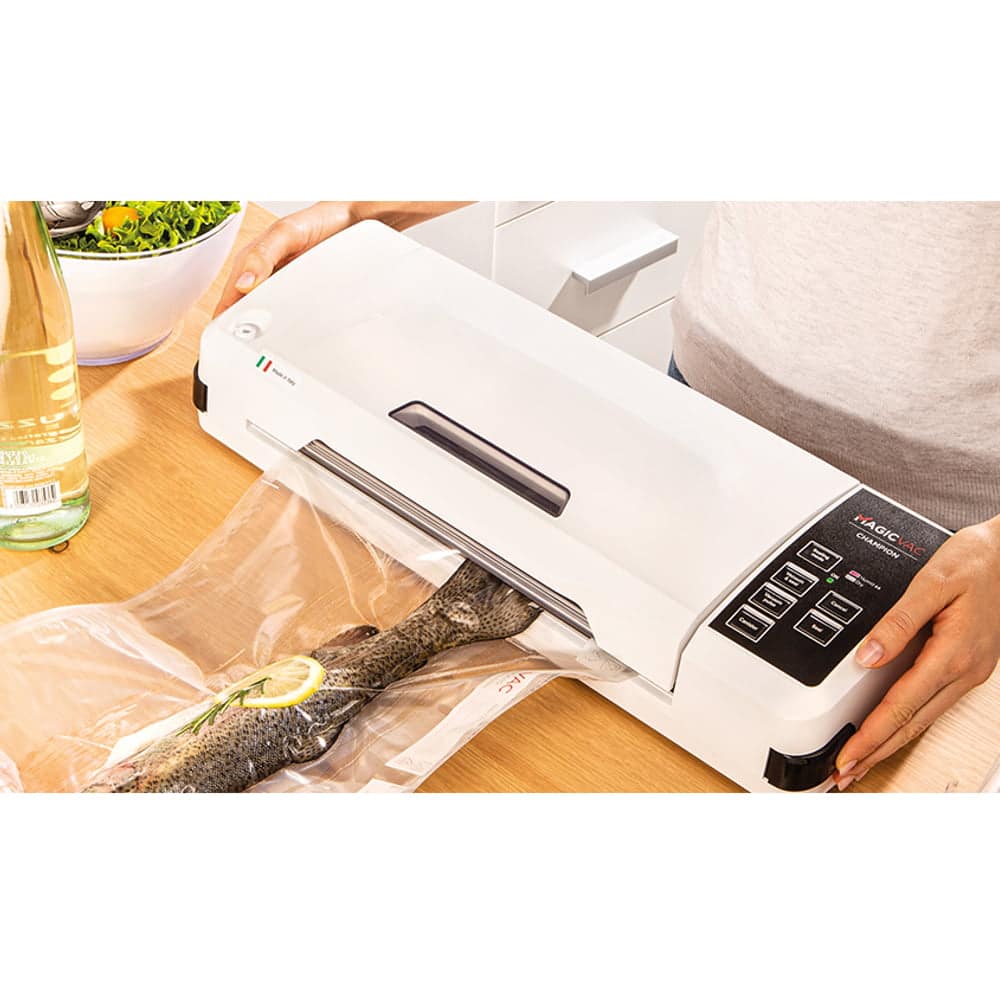 Aparatul de vidat Champion de la Magic Vac va mentine alimentele proaspete de 5 ori mai mult decat metodele traditionale de conservare datorita tehnologiei patentate de inalta calitate. Aparatul este prevazut cu un geam practic care va permite sa vedeti pungile si sa le pozitionati corect pe bara de etansare. Simplu si automat, usor de utilizat datorita sistemului de blocare si deblocare, cu acest aparat de vidat procesul de vidare si sigilare este unul eficient si optim.