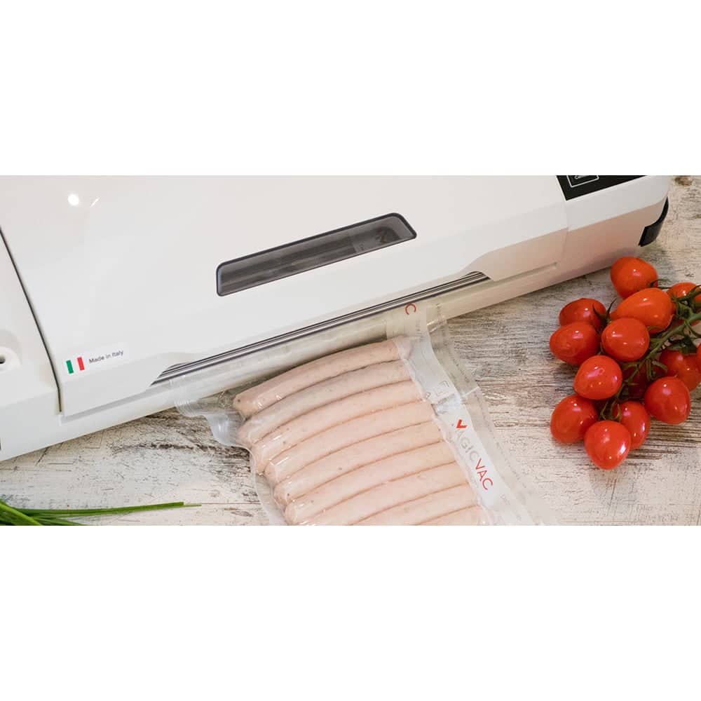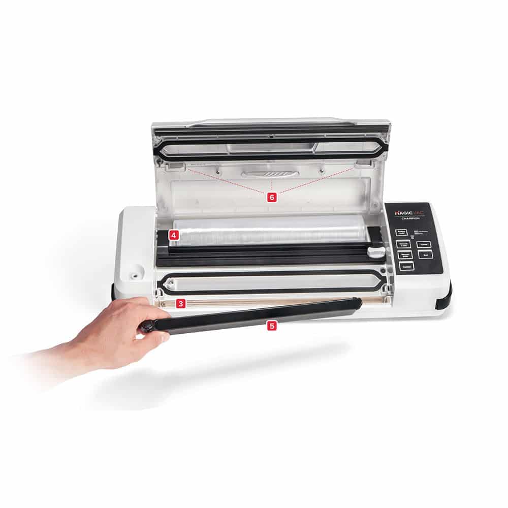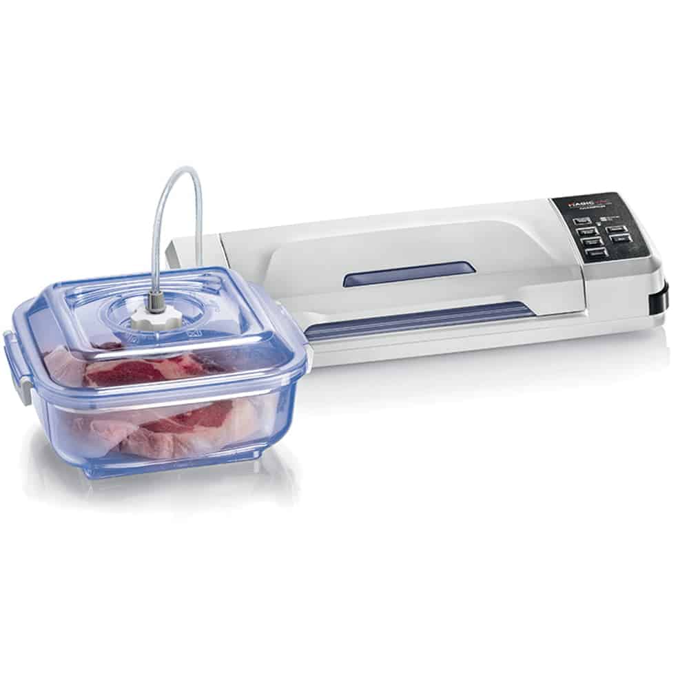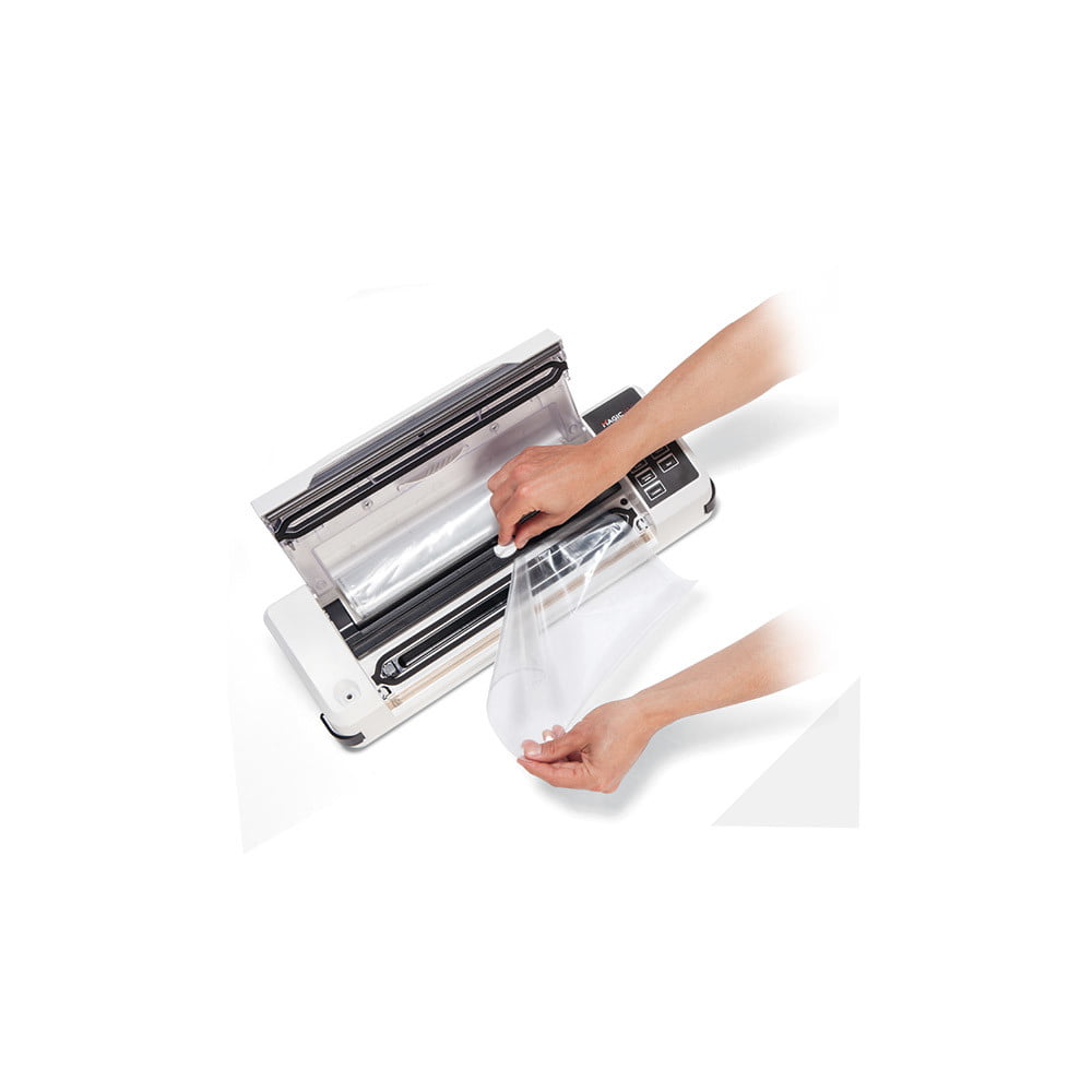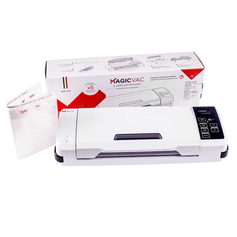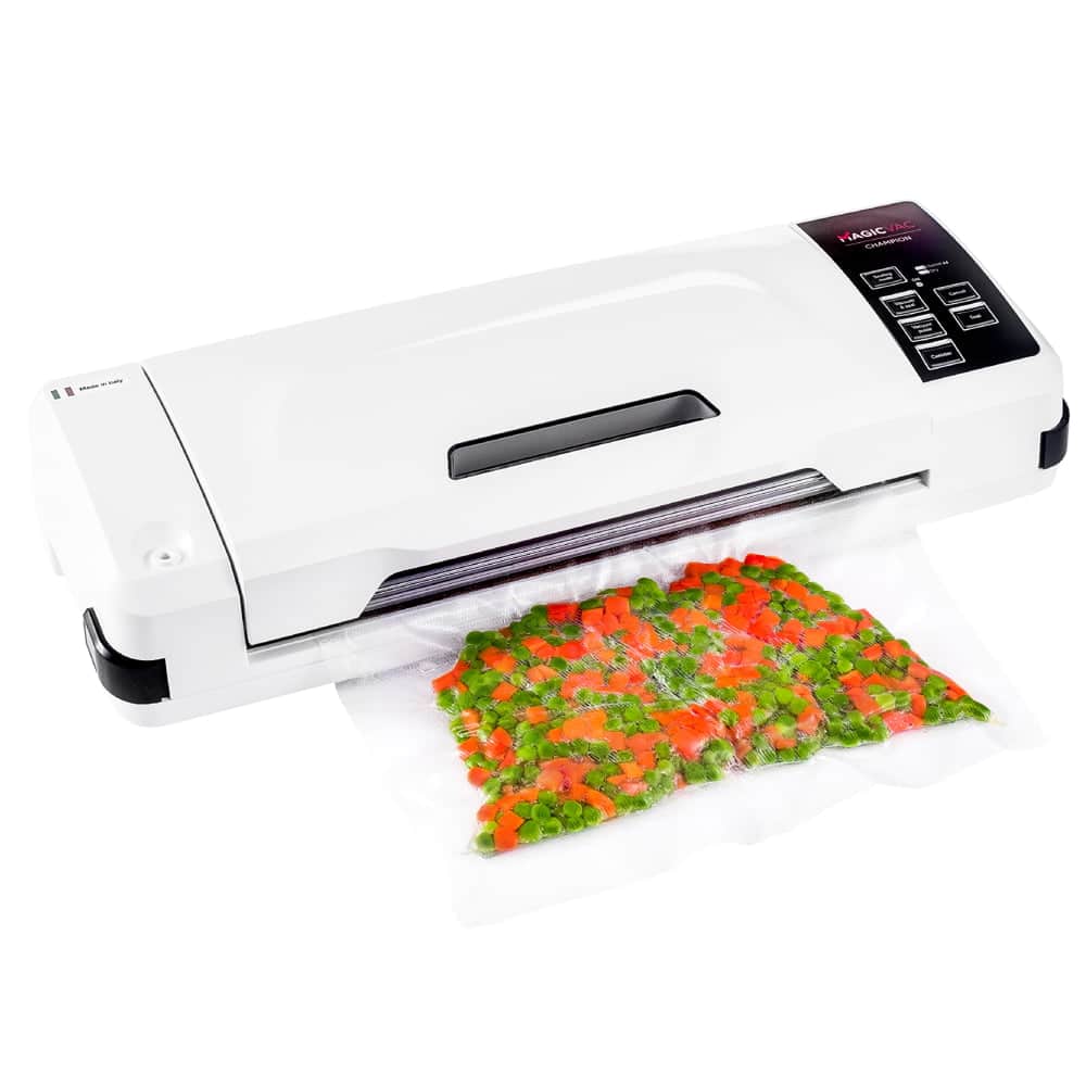 Aparatul de vidat Champion de la Magic Vac va mentine alimentele proaspete de 5 ori mai mult decat metodele traditionale de conservare datorita tehnologiei patentate de inalta calitate. Aparatul este prevazut cu un geam practic care va permite sa vedeti pungile si sa le pozitionati corect pe bara de etansare. Simplu si automat, usor de utilizat datorita sistemului de blocare si deblocare, cu acest aparat de vidat procesul de vidare si sigilare este unul eficient si optim.