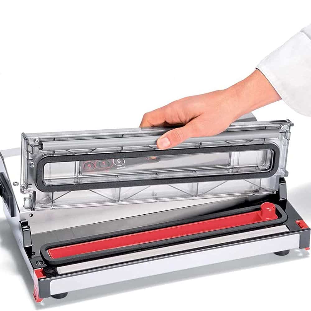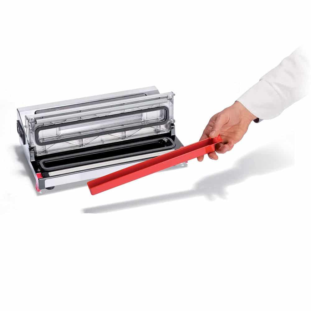 Sistemul patentat Lock & Unlock permite efectuarea unui ciclu automat de ambalare, prin inchiderea si deschiderea usoara a aparatului si pentru o pozitionare corecta a pungii. Bara de sigilare are un sistem de racire intregrat, ce promite utilizarea aparatului in mod intens fara a fi nevoie de pauze intre ciclurile de vidare.