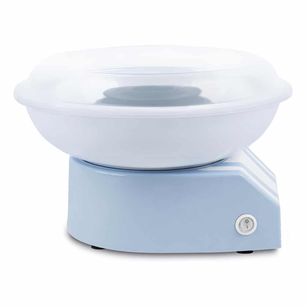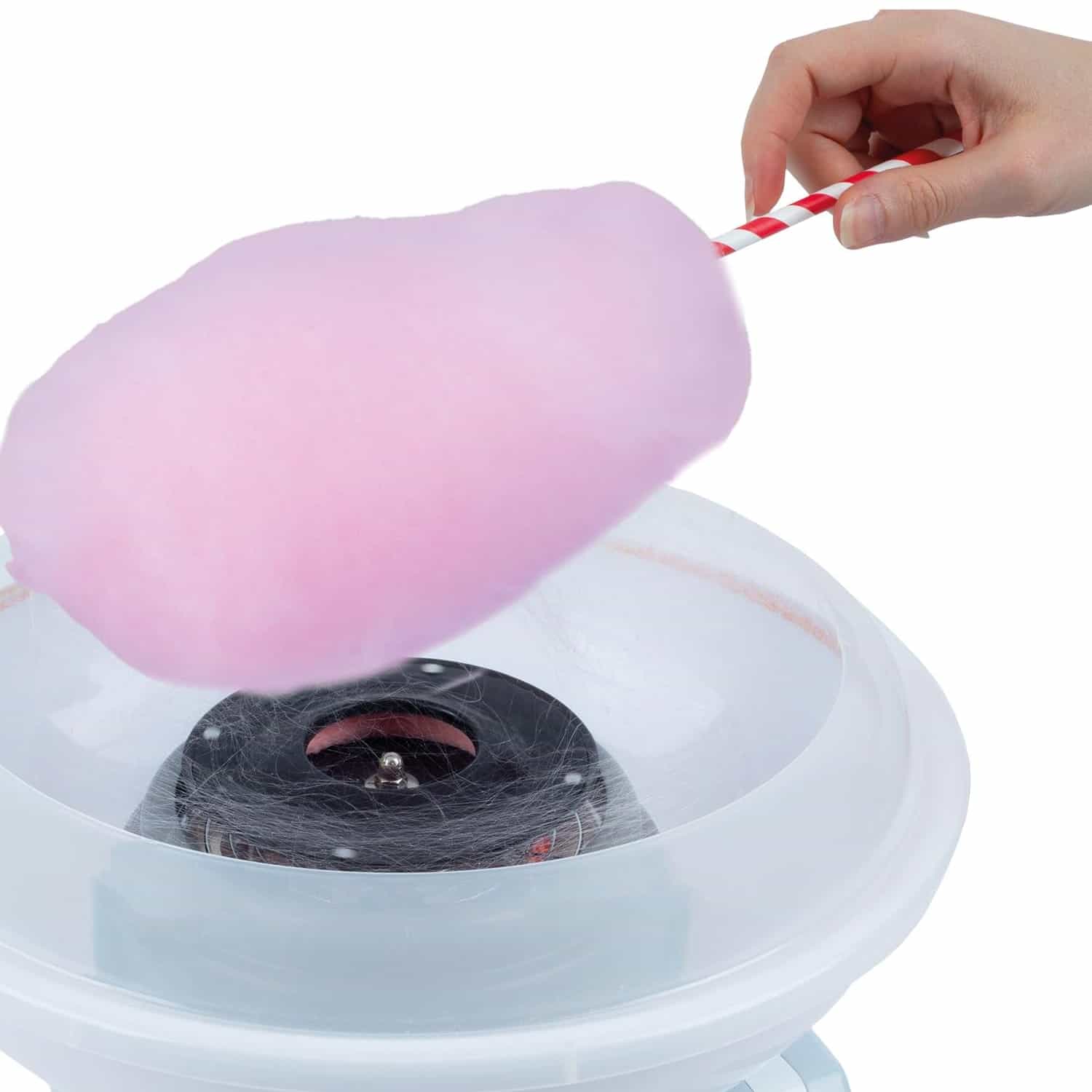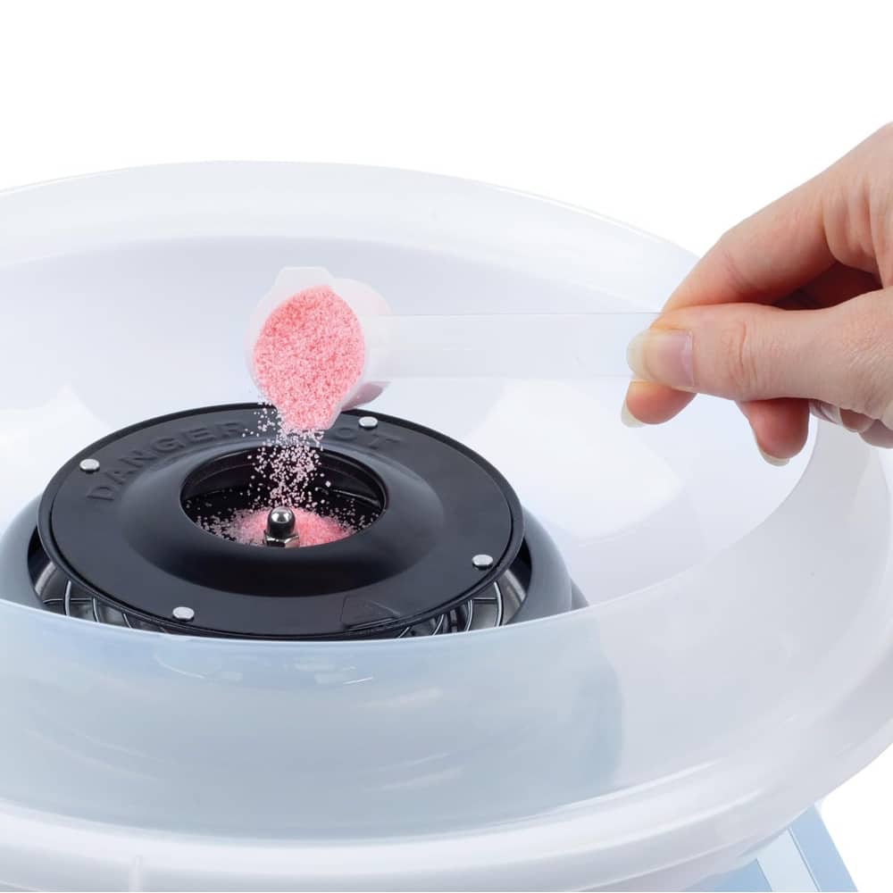 Aparatul de vata de zahar este usor de folosit. Tot ce trebuie sa faceti este sa conectati aparatul la priza, sa turnati zahar si sa apasati butonul de pornire. Cand vata de zahar se formeaza, o adunati cu ajutorul unui betisor din lemn.