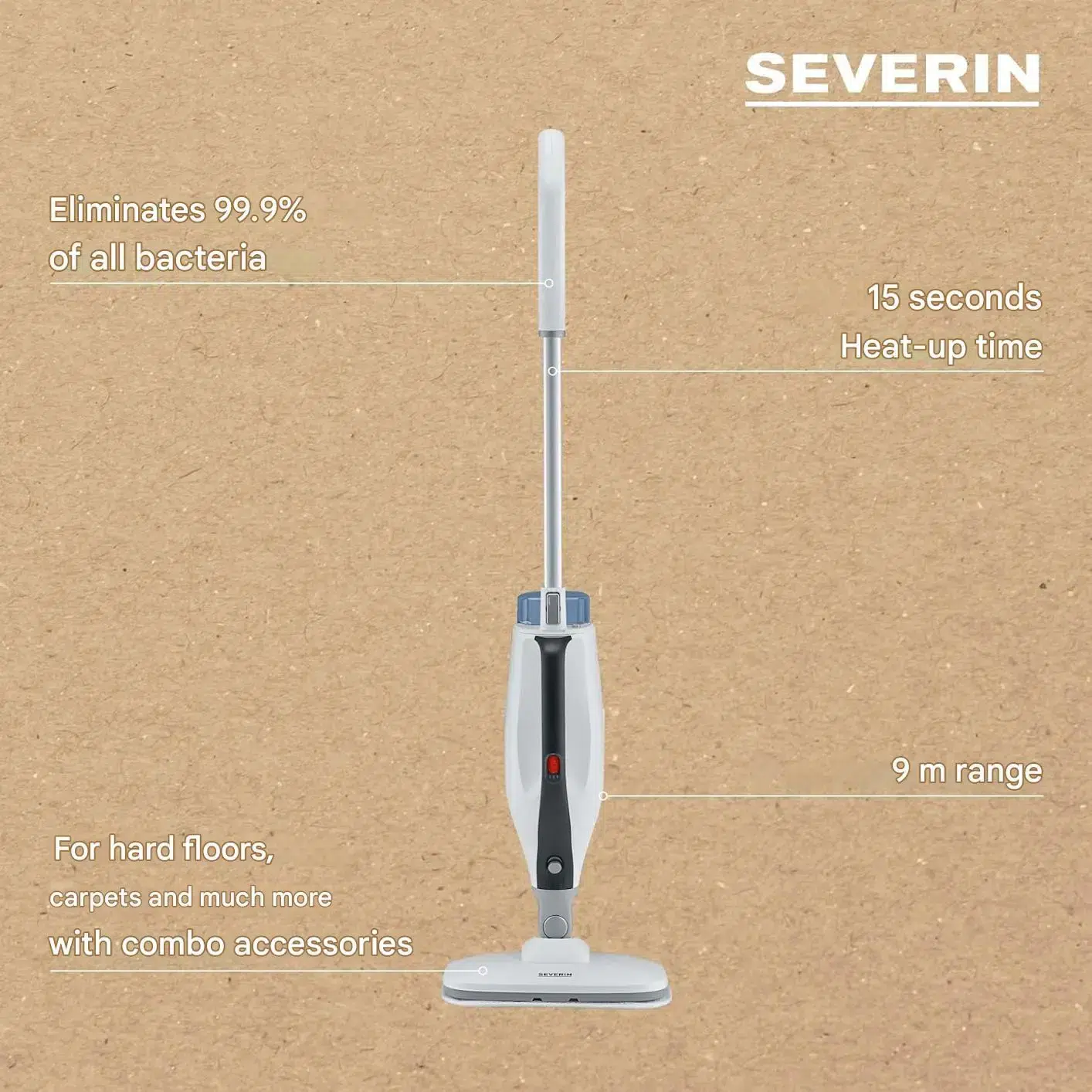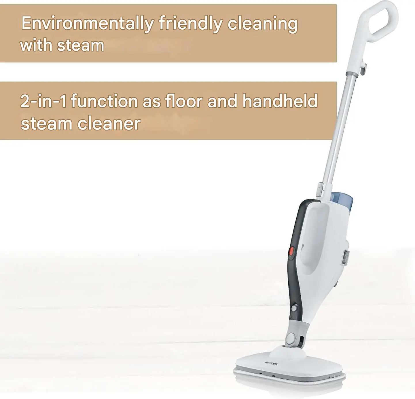 Aparatul de curatare cu aburi Severin 2in1 iti permite sa cureti si sa igienizezi complet suprafetele, de la podea sau mocheta pana la tavan, fara niciun efort si in timp record datorita presiunii. Astfel, aparatul elimina eficient acarienii, virusurile si bacteriile pentru un mediu sanatos si curat.