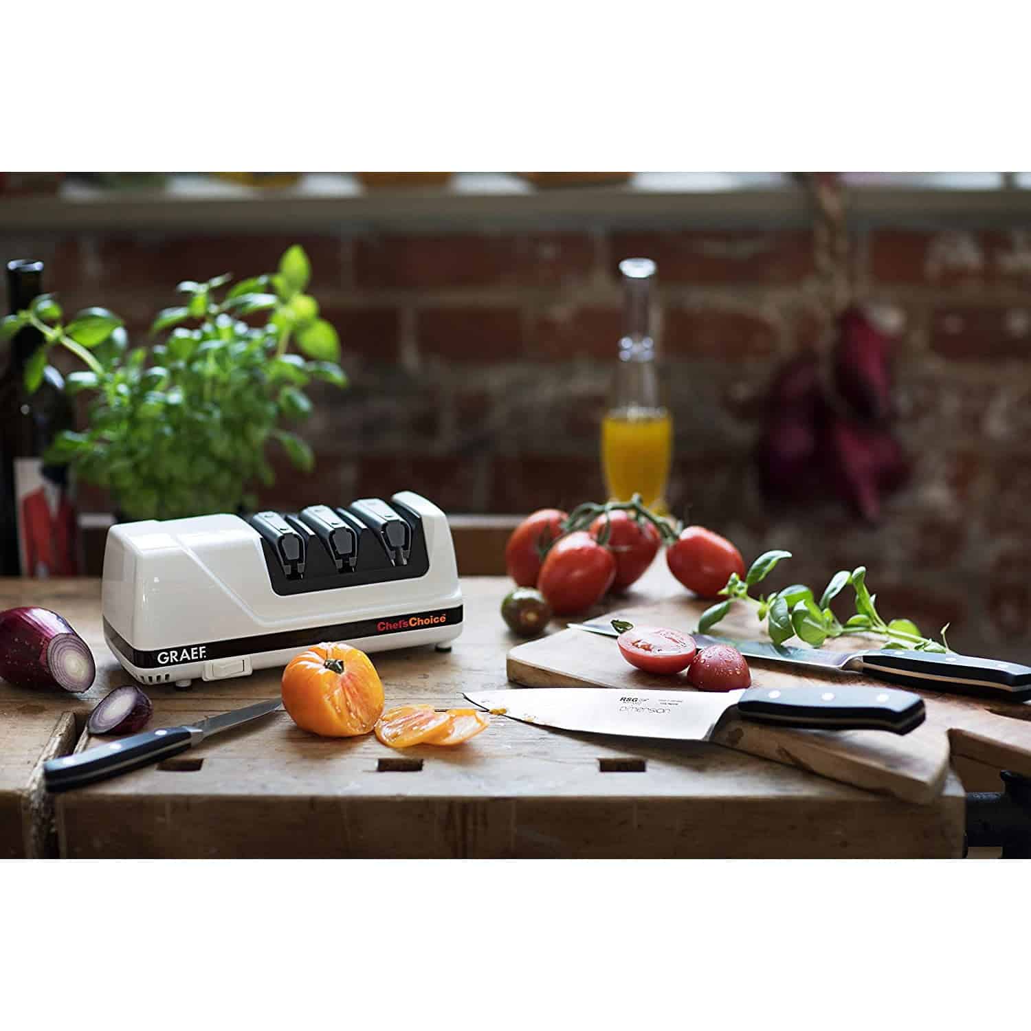 In loc de otel, dispozitivul profesional de ascutit cutite Graef CC120 foloseste discuri diamantate. Acest lucru permite motorului sa ruleze mai lent, minimizand frecarea si, in consecinta, oferind un aspect matuit lamei cutitelor dumneavoastra, nu unul lucios.