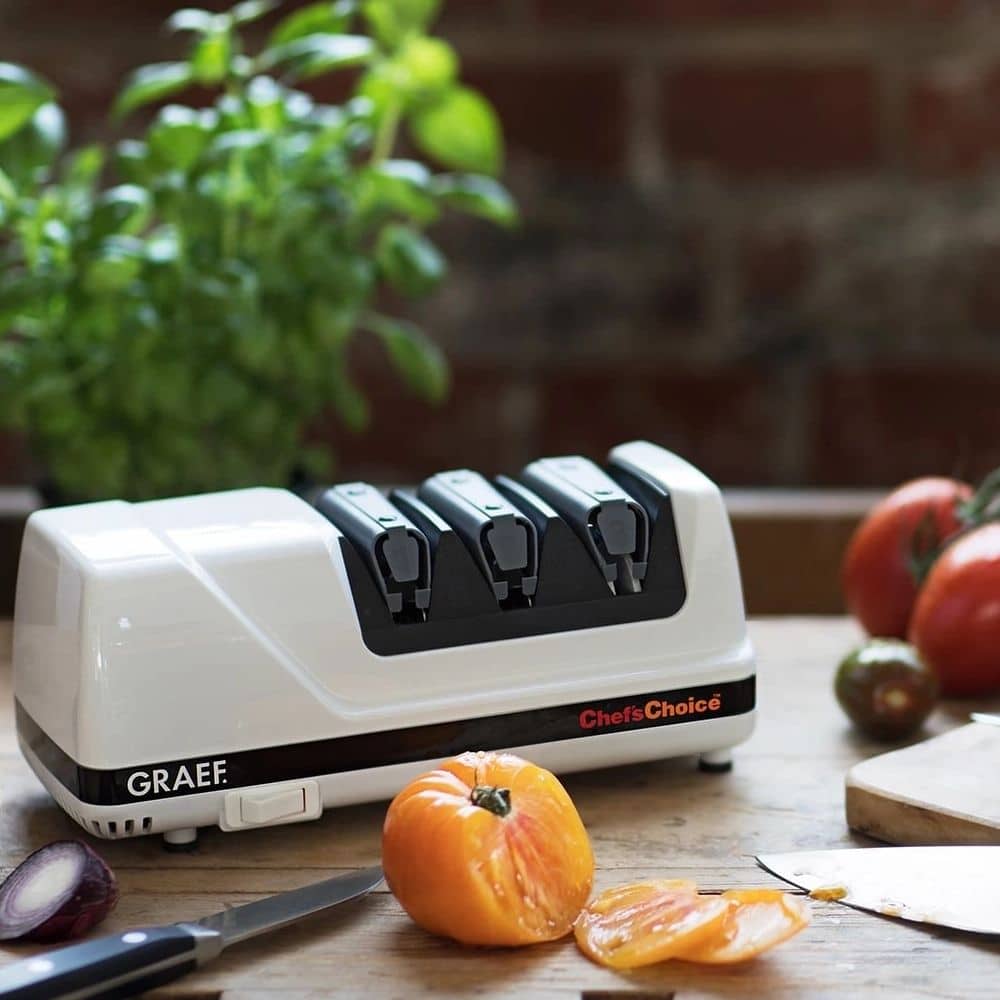 In loc de otel, dispozitivul profesional de ascutit cutite Graef CC150 foloseste discuri diamantate. Acest lucru permite motorului sa ruleze mai lent, minimizand frecarea si, in consecinta, oferind un aspect matuit lamei cutitelor dumneavoastra, nu unul lucios.