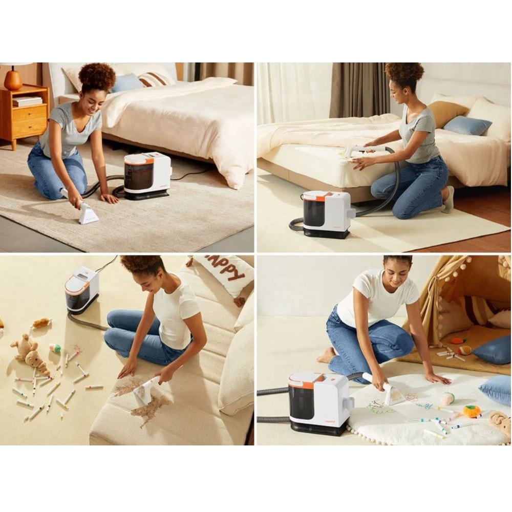 Avand un design compact, usor de transportat, aspiratorul are o putere mare de curatare si doua rezervoare pentru apa, respectiv apa reziduala. Dispozitivul este dotat cu o perie speciala pentru a indepartarea eficienta a petelor, oferind rezultate excelente in scurt timp. Mai mult, in rezervor poti turna apa calda (maxim 55°C) pentru o curatare mai eficienta.