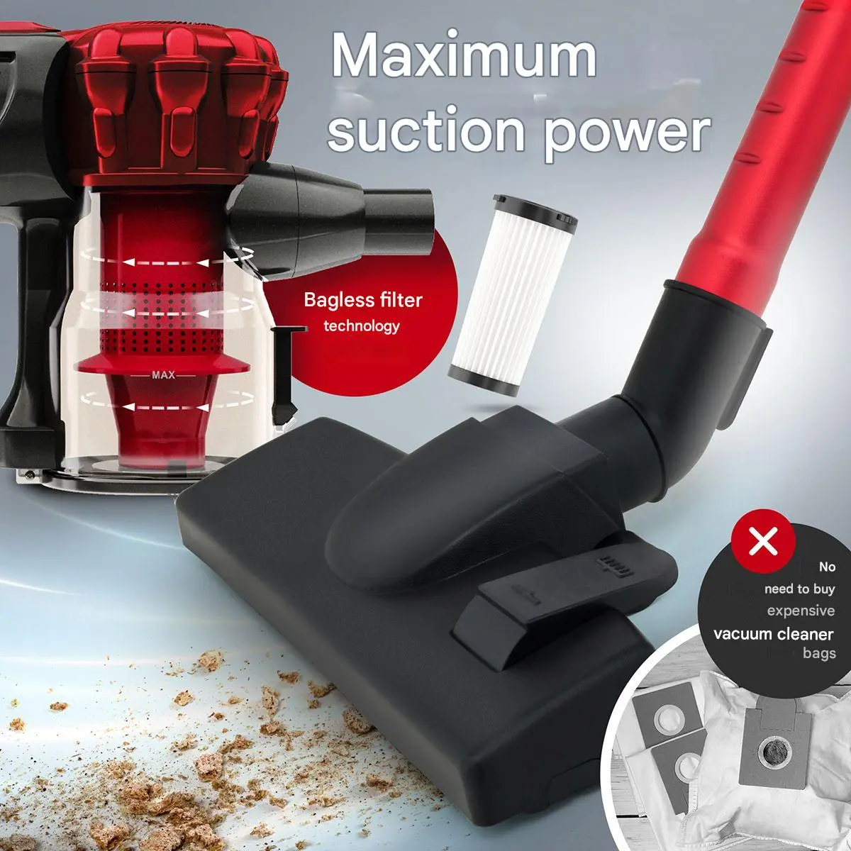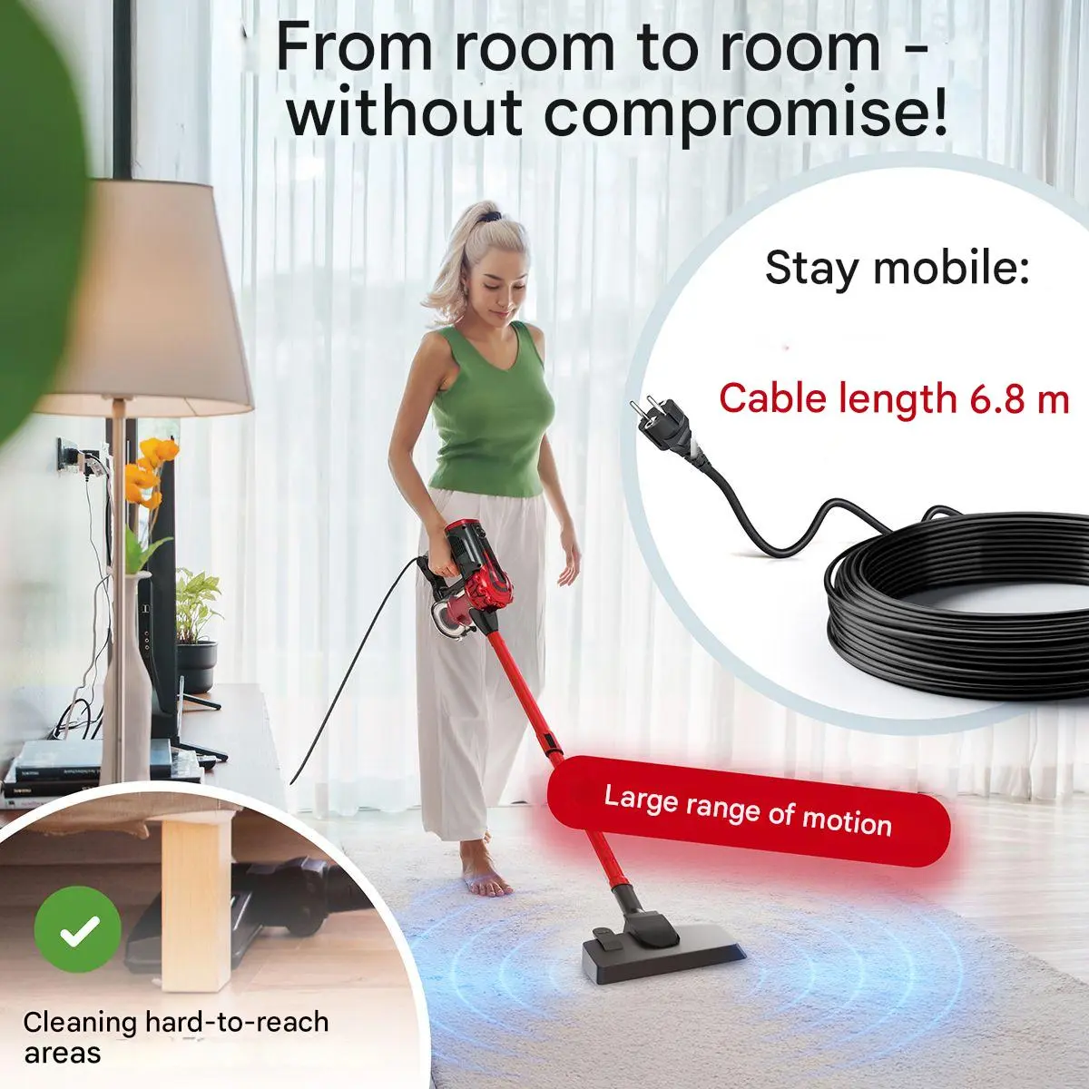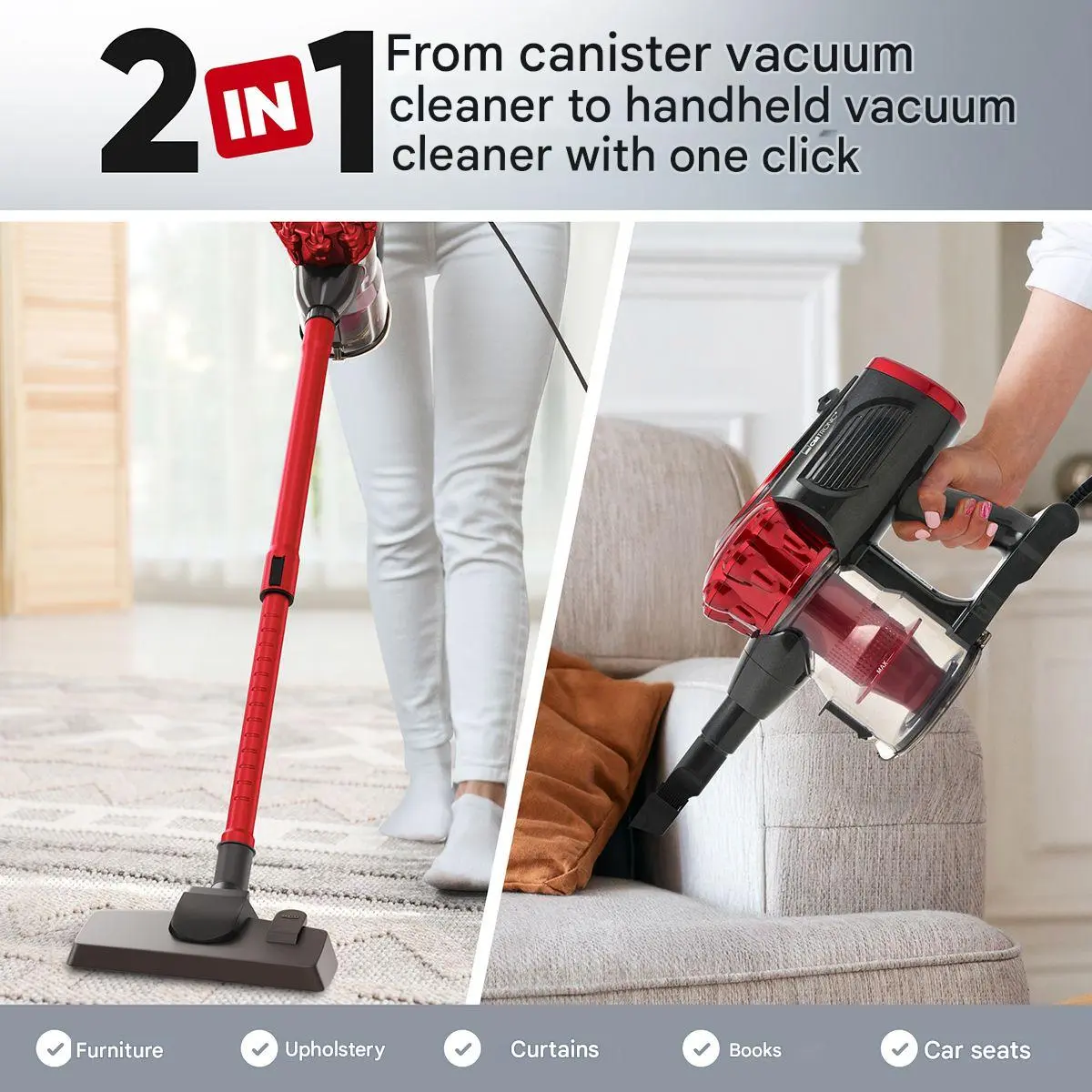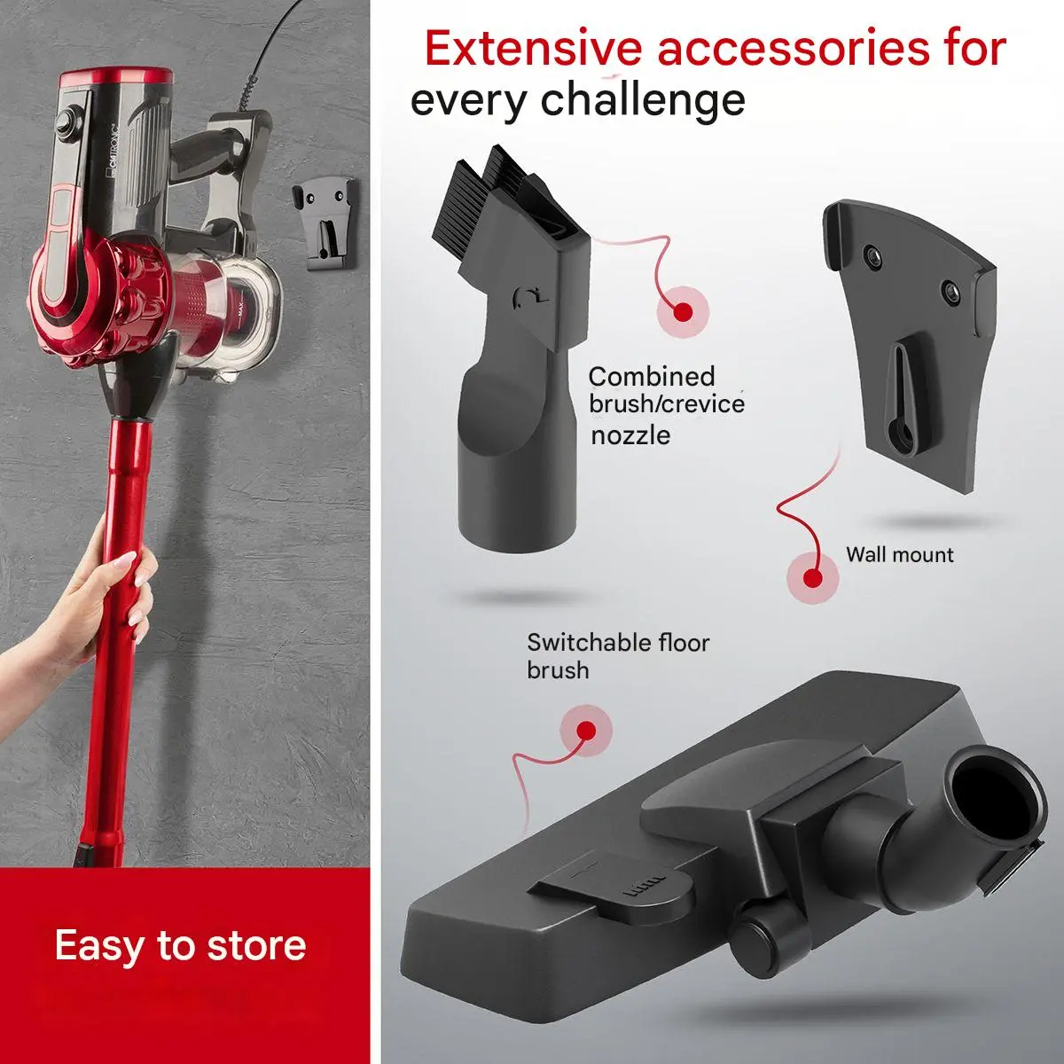 Acest aspirator vertical poate fi transformat in aspirator de mana. De asemenea, accesoriile incluse – perie pentru podele dure si duza tip perie pentru spatii inguste – iti vor veni in ajutor pentru o curatare facila, in toate colturile locuintei.