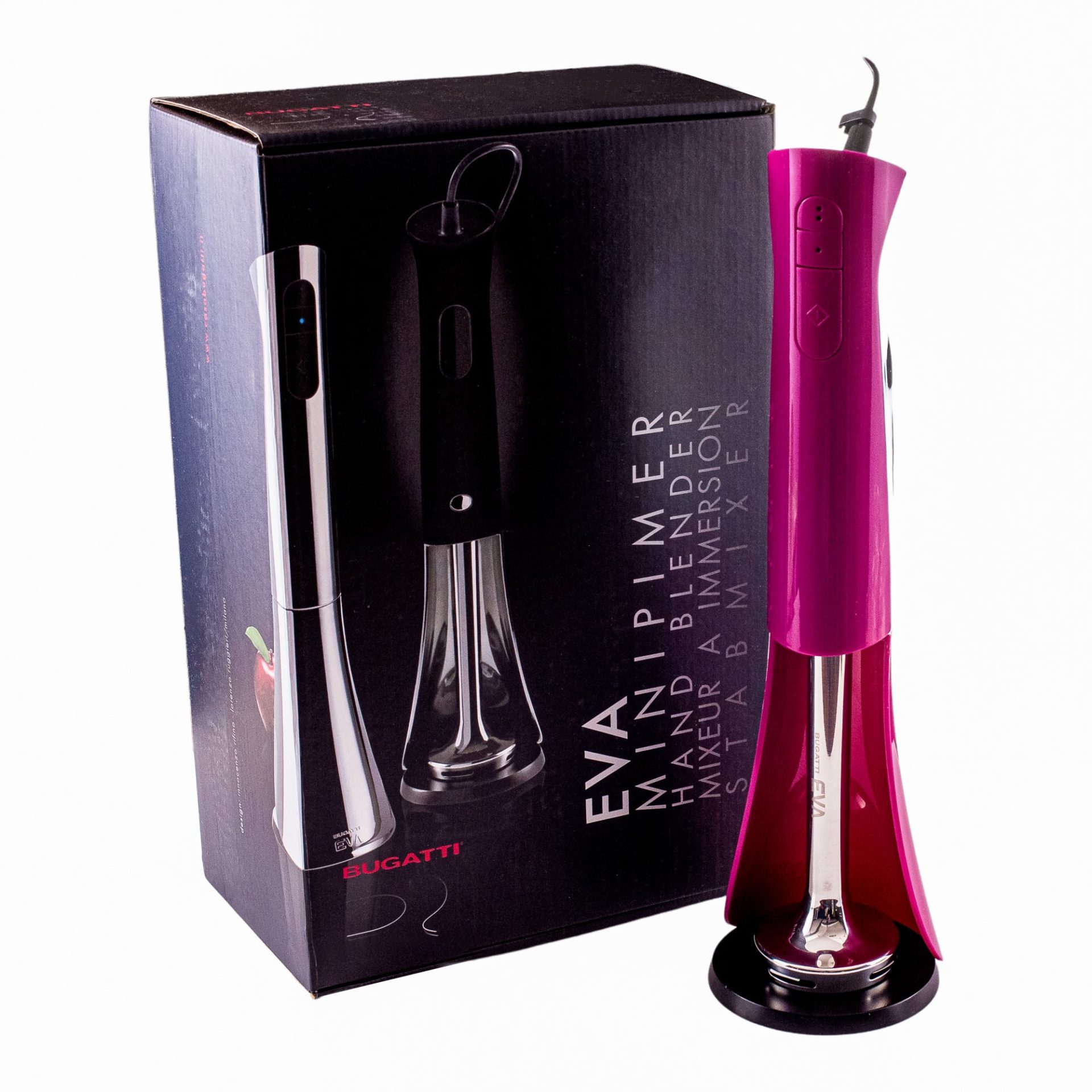 Blenderul de mana Eva, de la Casa Bugatti, va aduce un strop de culoare bucatariei dumneavoastra, datorita designului modern, minimalist, in nuante vii. Eva incorporeaza versatilitate, putere si ergonomie intr-o forma eleganta. Simplu, sigur si fiabil de utilizat. Senzația perceputa de mana este ferma si precisa datorita manerului ergonimic. Cele doua viteze permit optimizarea puterii si energiei, iar senzorul de siguranta impiedica pornirea accidentala a aparatului: motorul incepe sa functioneze numai daca senzorul este bine acoperit de palma mainii.