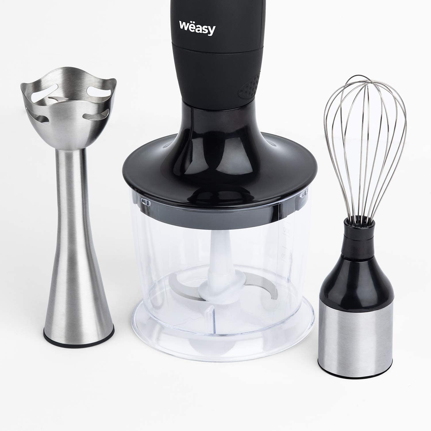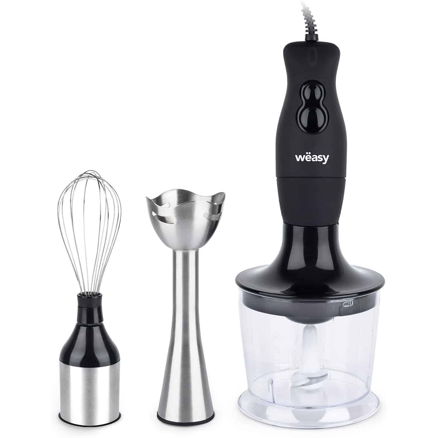 Mixerul 3 in 1 de la Weasy este un ajutor in orice bucatarie. Fiind un set format din mixer de mana, tocator universal si tel, puteti face mai multe sarcini in cel mai scurt timp, facilitandu-va o preparare rapida a mancarilor si bauturilor delicioase. In acest mod aveti la dispozitie dispozitive diferite indispensabile oricarei bucatarii. Fie ca doriti sa faceti o supa crema calda sau mancare pentru bebelusi cu blenderul de mana, sa tocati marunt ierburi si ingrediente cu ajutorul tocatorului sau sa bateti cu usurinta albusurile de ou cu telul, mixerul 3 in 1 de la Weasy functioneaza rapid si eficient.
