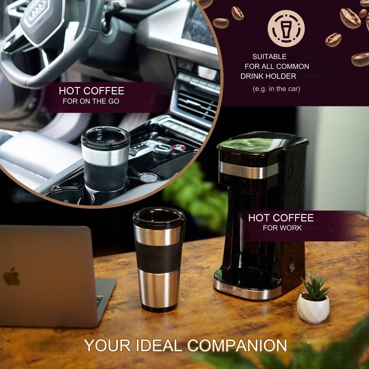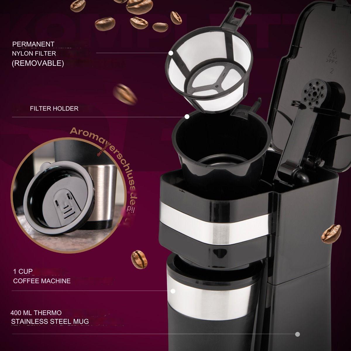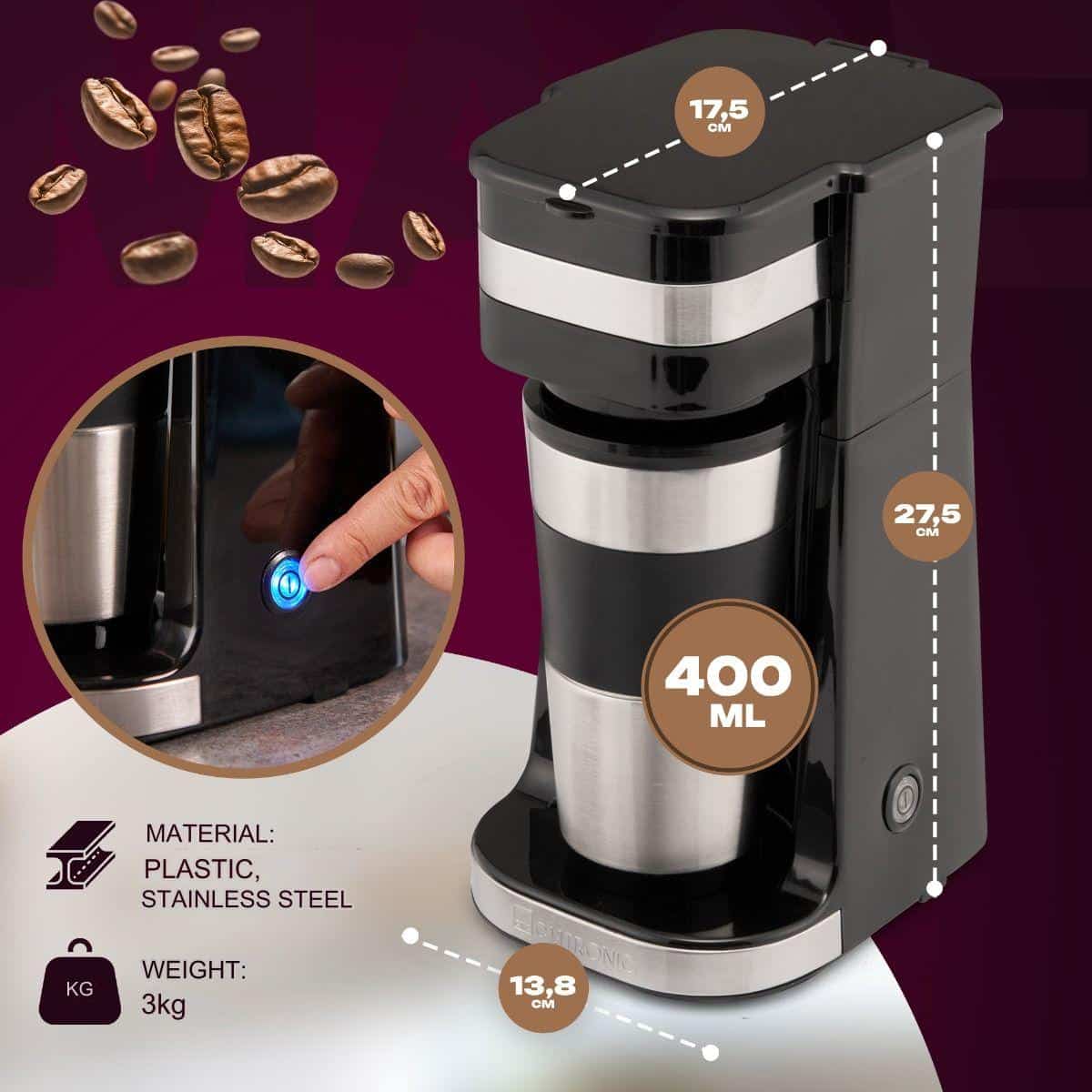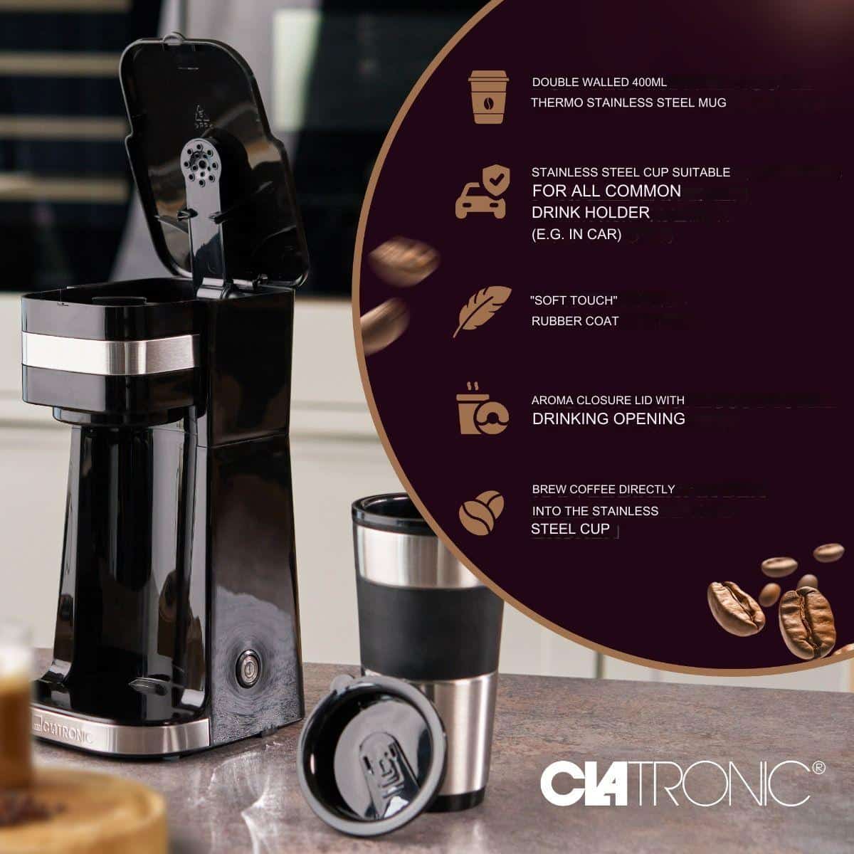 Cafetiera de la brandul german Clatronic, este perfecta pentru dimineti in graba! Designul unic al acestui aparat va permite sa va luati cafeaua la pachet, rapid si usor, fara a fi nevoie sa transferati bautura in termos.