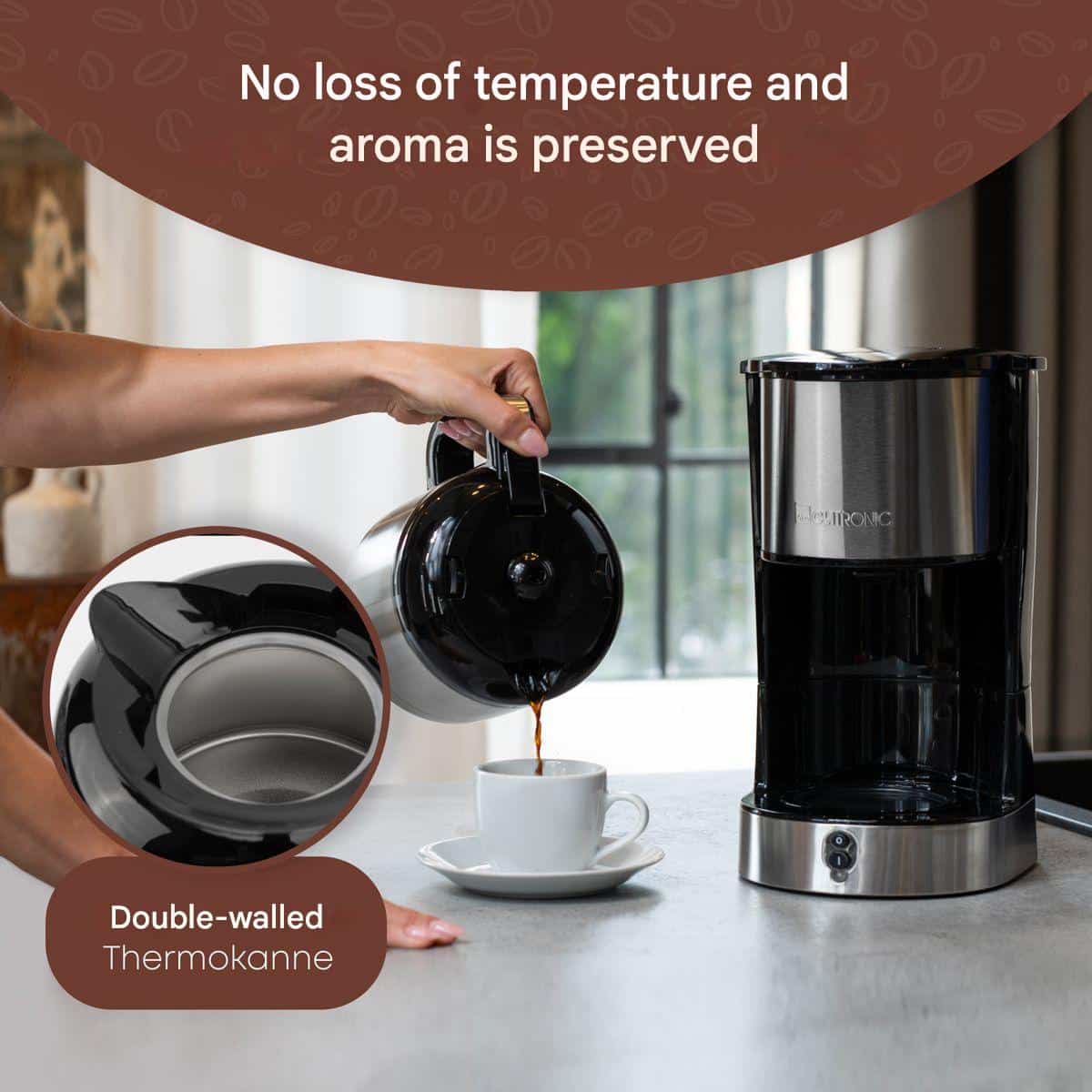 Practica, avand o capacitate de 1.5 litru si fiind extrem de usor de folosit, cafetiera iti va mentine cafeaua calda multumita peretilor dubli ai carafei din otel inoxidabil.