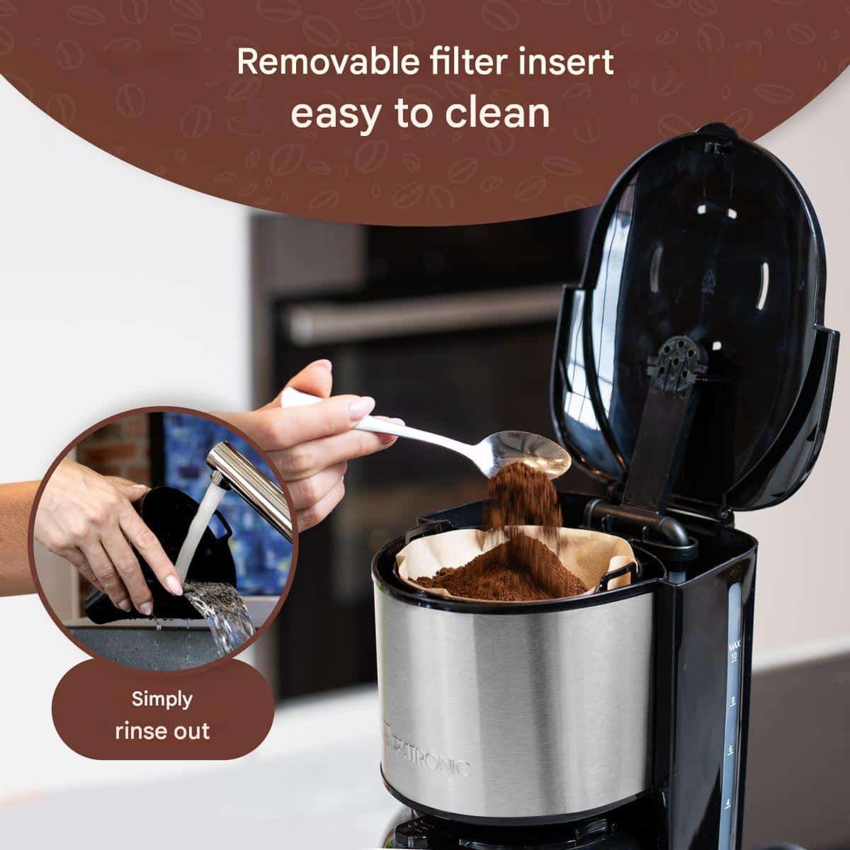 Aparatul va asigura pana la 10 cesti de cafea aromata si cremoasa, suficienta pentru intreaga familie, dar si pentru invitati. Filtrul de cafea se poate detasa usor pentru a fi curatat. Functia anti-picurare nu permite cafelei sa curga dupa ce carafa a fost scoasa din dispozitiv.