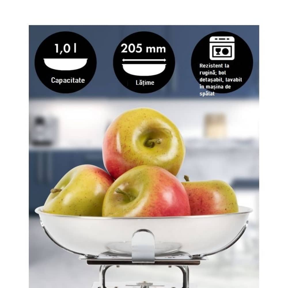 Mai mult, acest cantar este dotat cu functia Tara ce va permite sa adaugati ingrediente suplimentare in timp ce cantariti. Pentru a folosi aceasta functie, cantarul are o rotita ce trebuie ajustata, pozitionata sub bol.