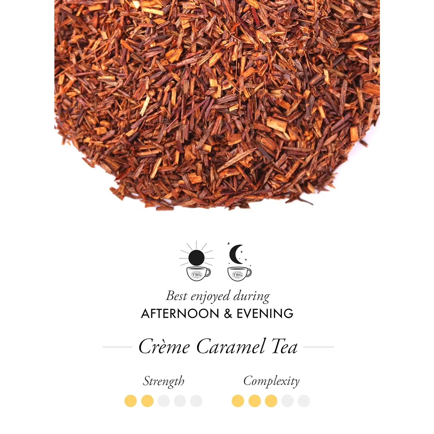 Ceaiul rooibos din Africa de Sud, amestecat cu condimente franceze TWG Tea creeaza infuzia Creme Caramel, fara teina, fiind potrivit pentru a fi consumat si de catre copii.