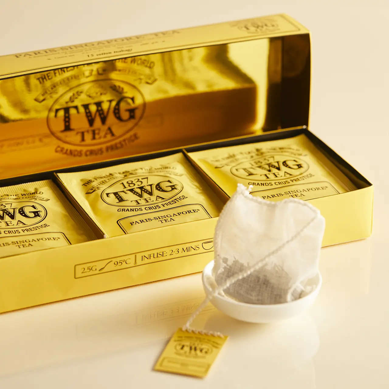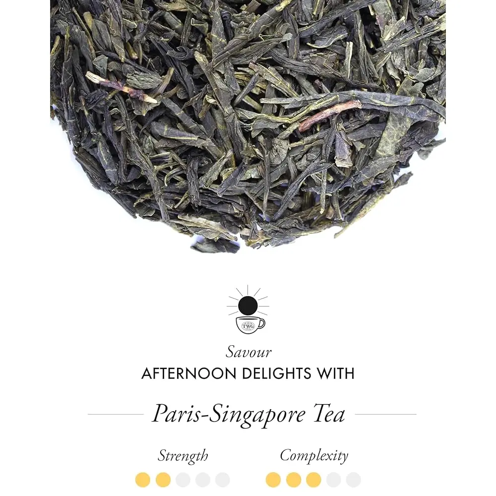 O specialitate traditionala japoneza de ceai verde rafinat, amestecat cu flori de cires si trandafir Paris Singapore Tea de la TWG Tea ofera o infuzie unica, aromata si rumenita. Un favorit al iubitorilor de ceai de toate varstele.