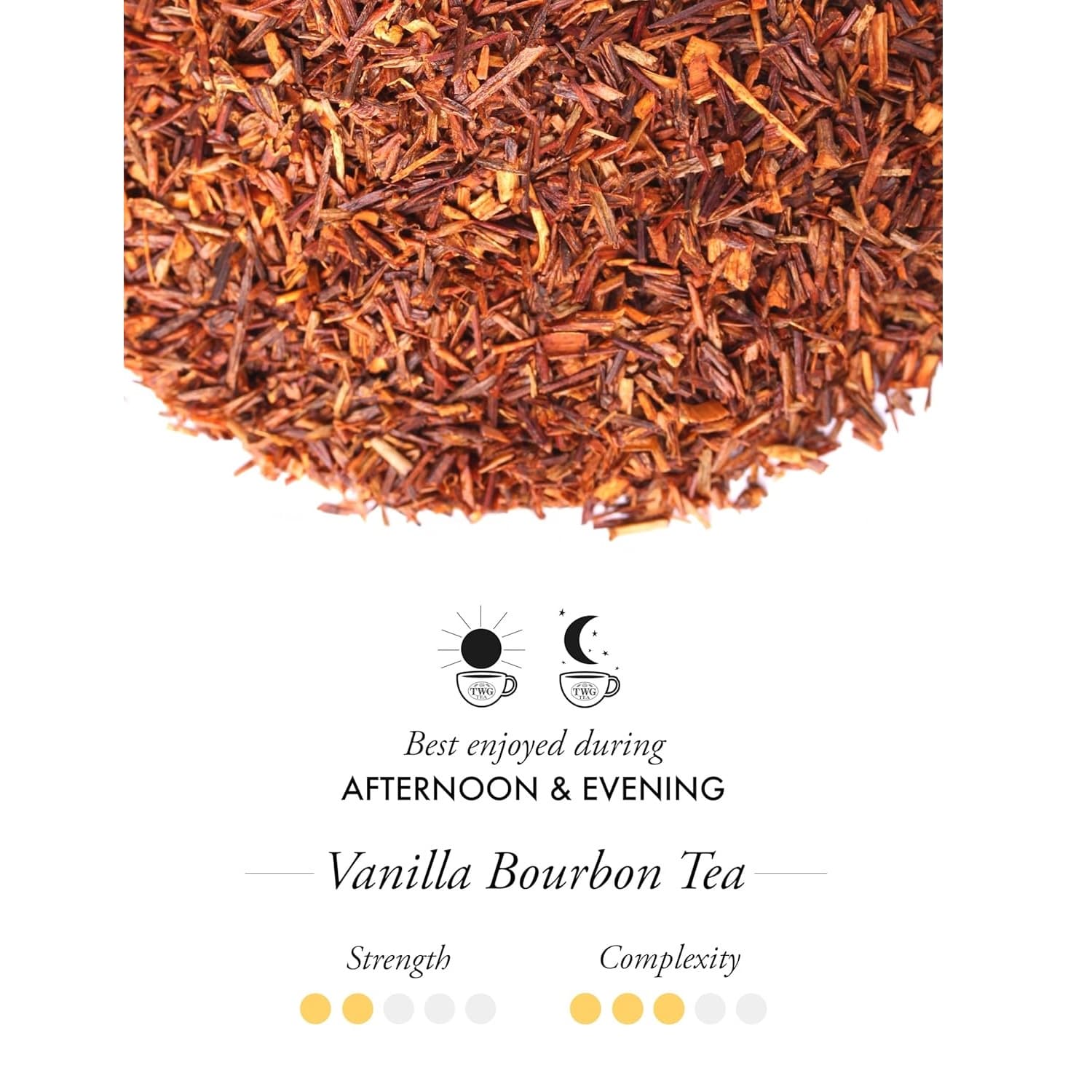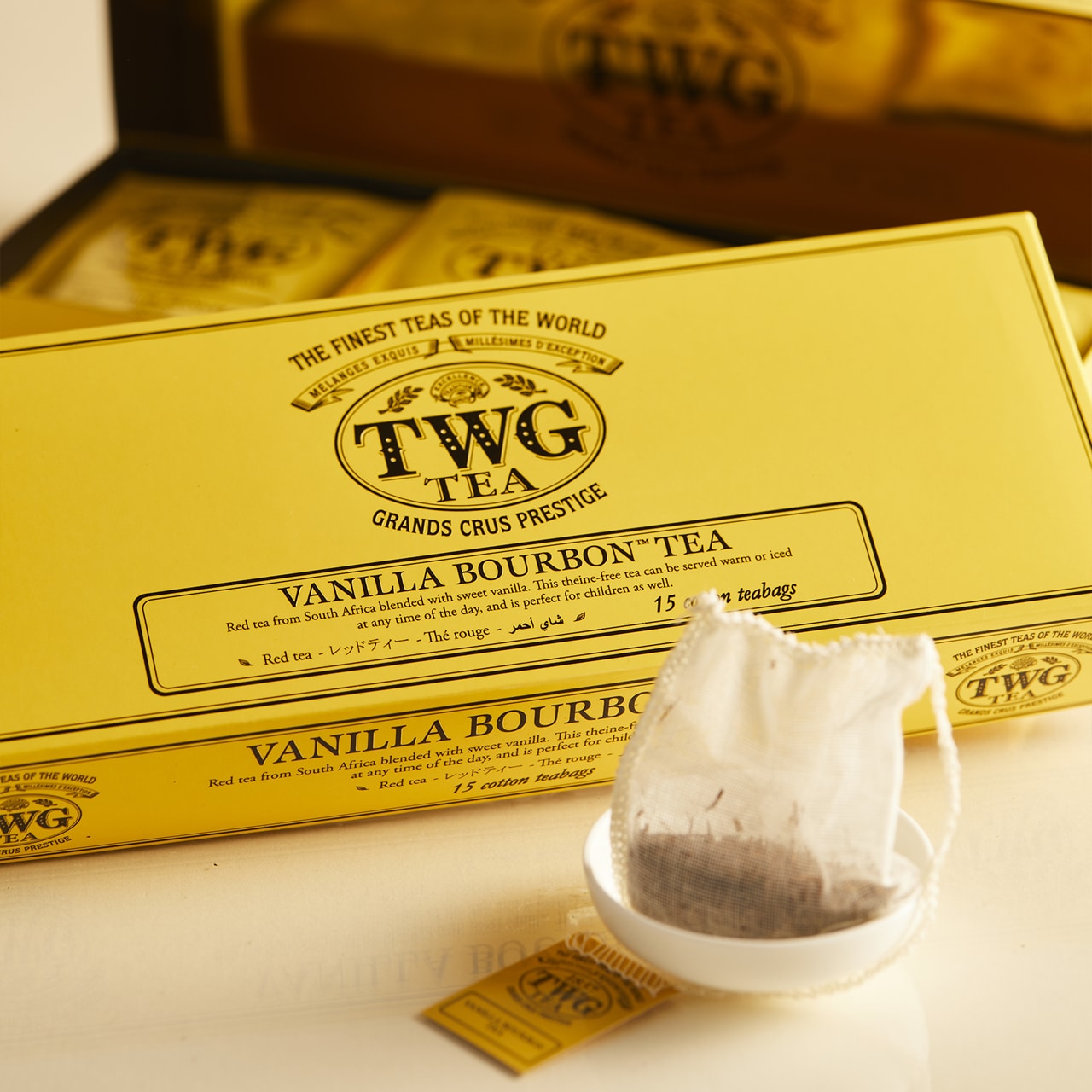 Ceaiul rooibos din Africa de Sud, amestecat cu vanilie dulce TWG Tea creeaza infuzia Vanilla Bourbon Team, fara teina, fiind potrivit pentru a fi consumat si de catre copii.
