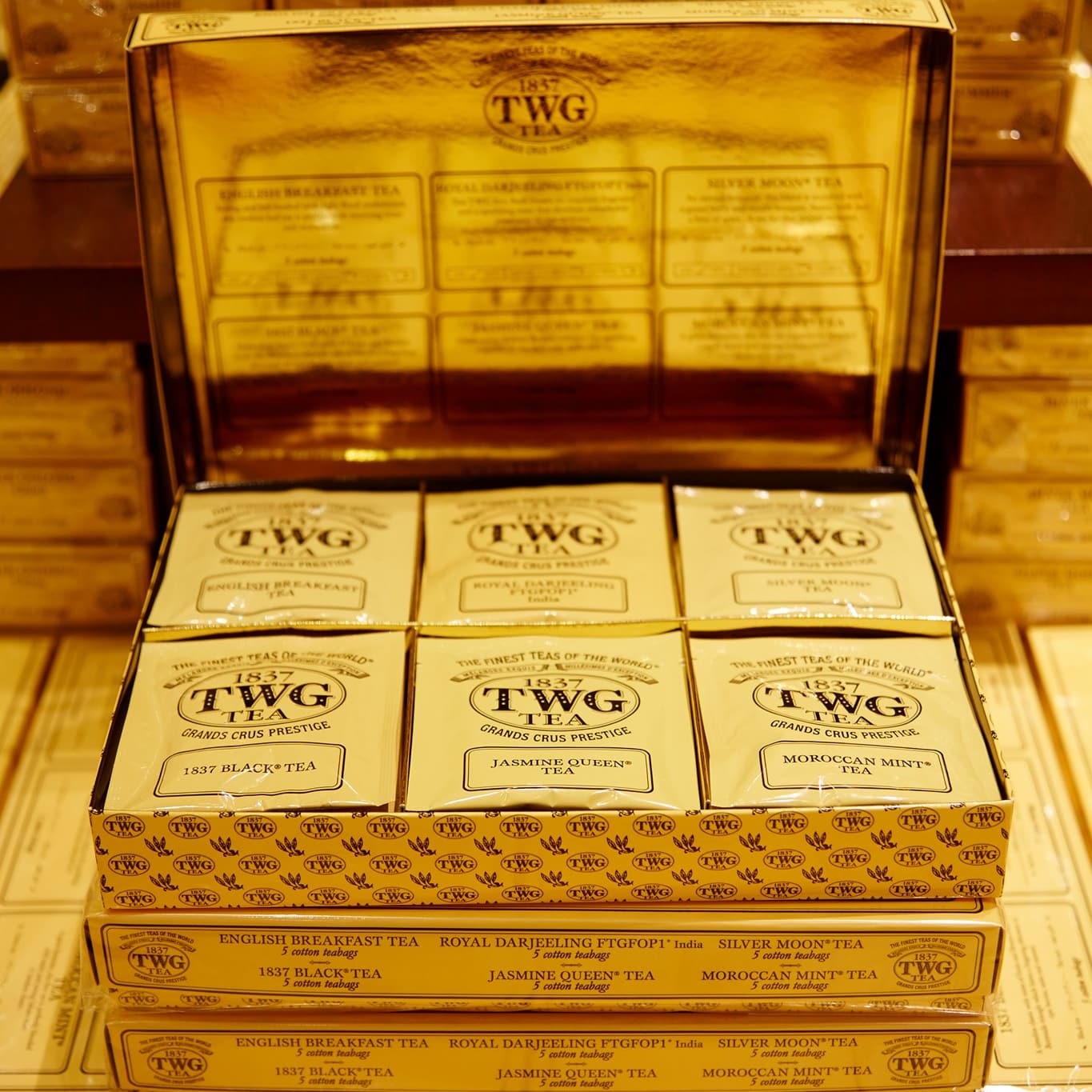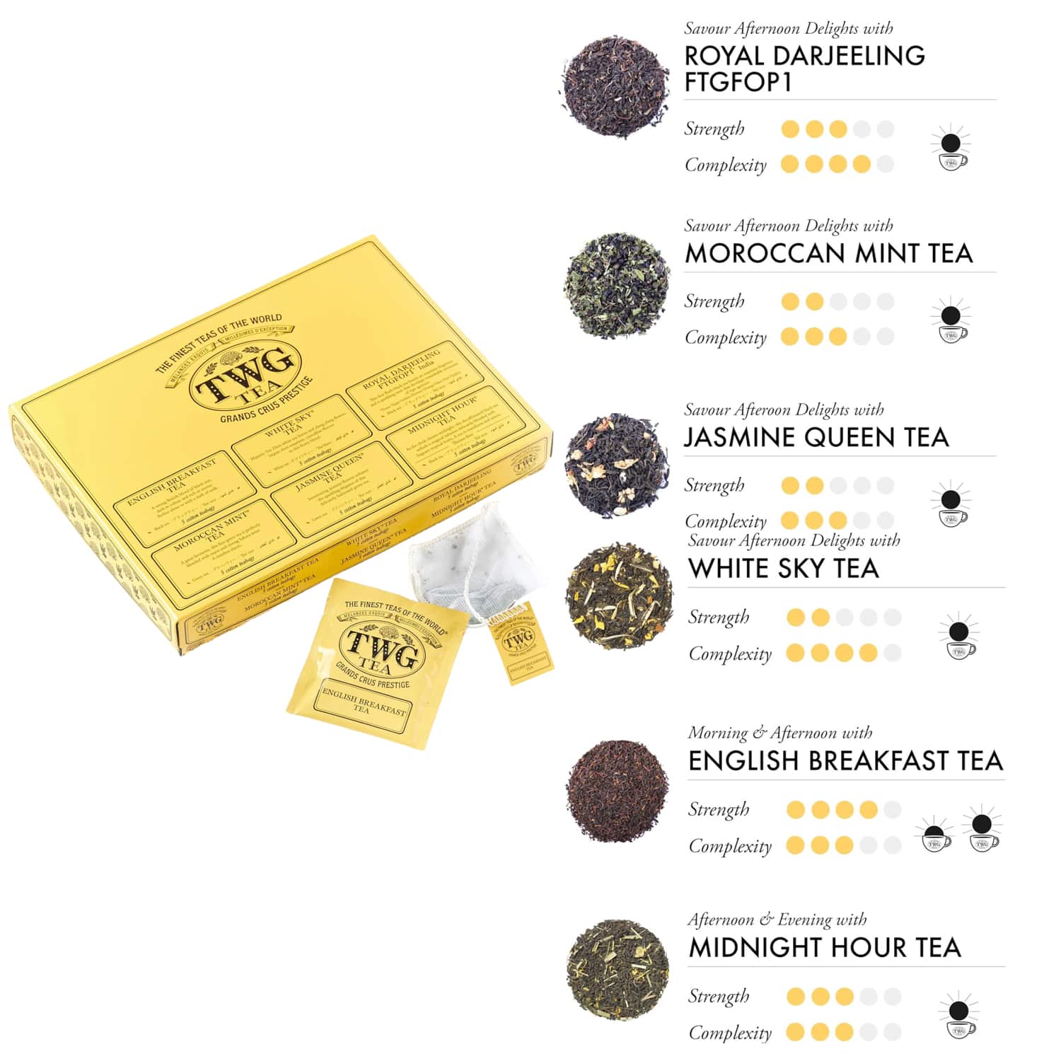Cele 6 varietati de ceai negru, alb, verde si decofeinizat combina note florale si fructate precum iasomie, ylang ylang, menta, piersici, dar si arome subtile de caramel sau cacao, ce vin in completarea meselor sau gustarilor tale.