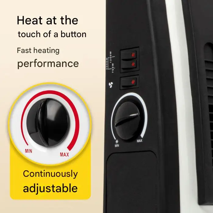 Convectorul Clatronic dispune, de asemenea, de functia de ventilator turbo ce propulseaza caldura in incapere pentru o incalzire rapida. Functia ventilatorului permite ca incalzirea sa fie mai rapida decat un convector traditional, deoarece aerul este fortat sa circule.