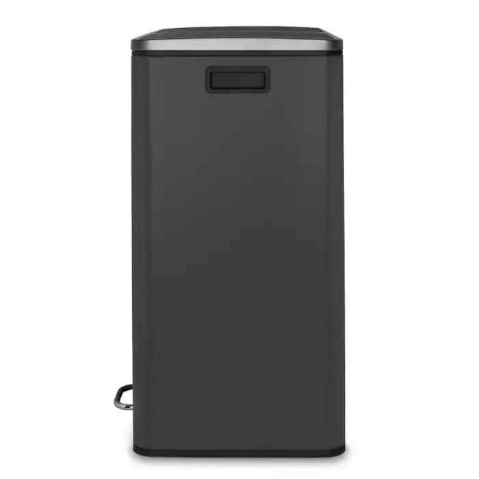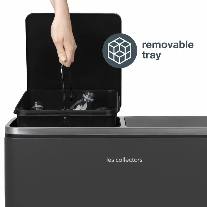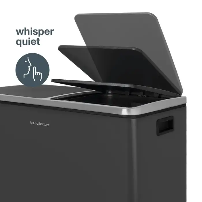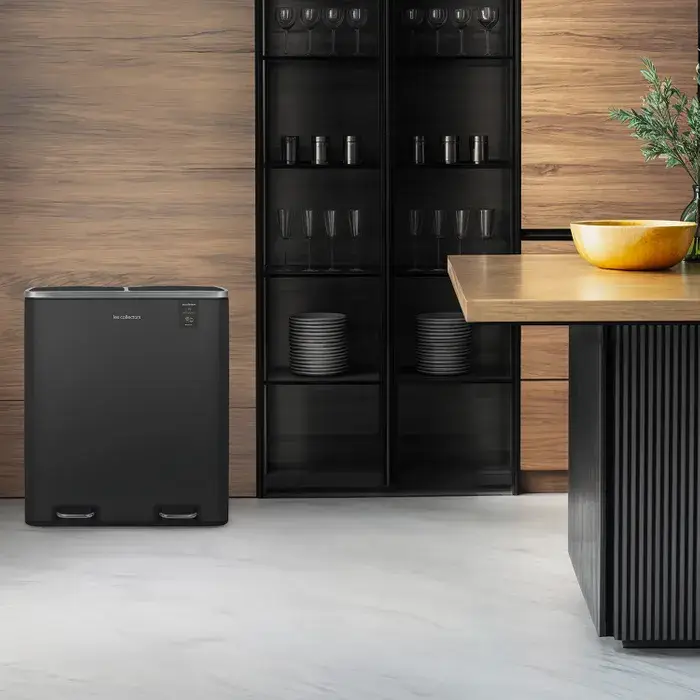 Fiecare compartiment are capacitatea de 30 litri, volumul total al cosului fiind de 60 litri. Exteriorul cosului de gunoi este fabricat din otel inoxidabil cu efect anti-amprenta.