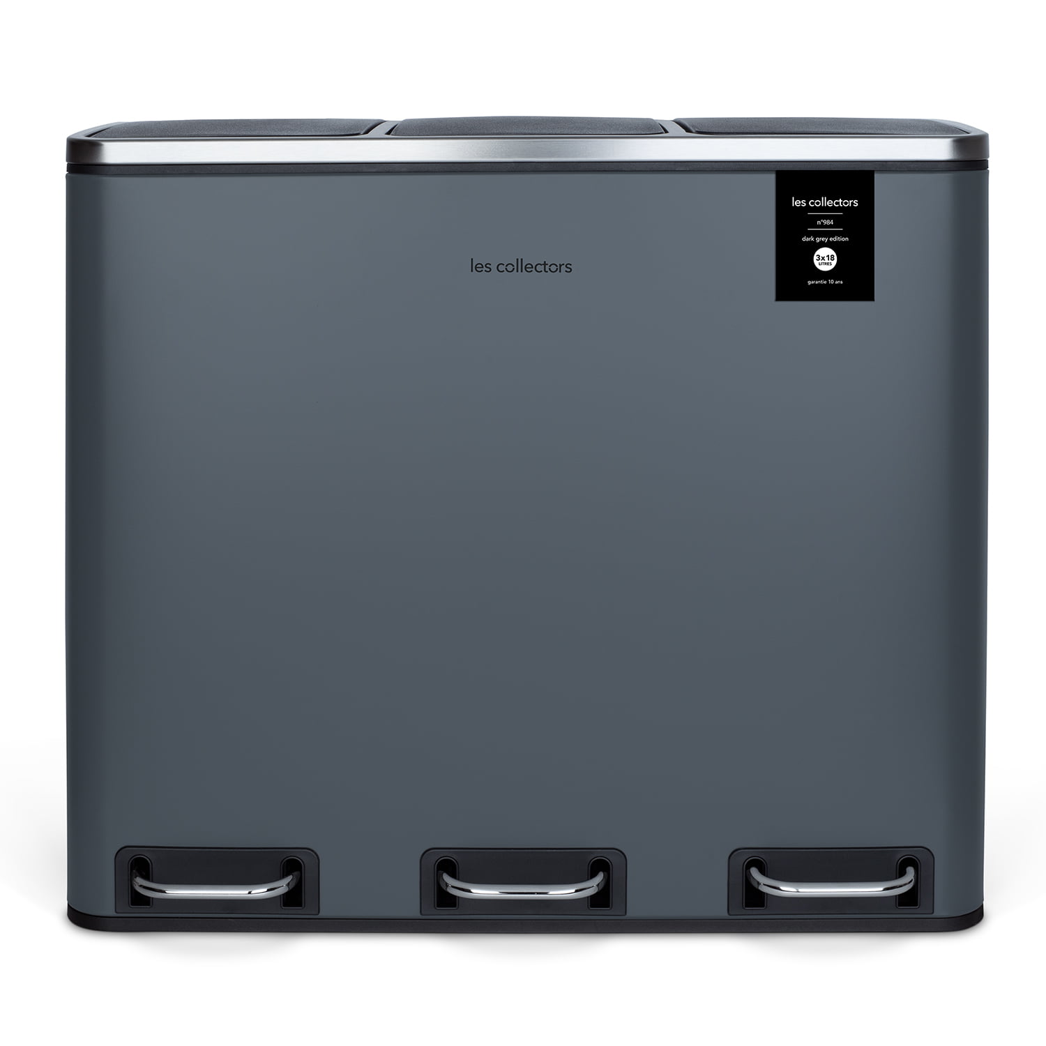 Cu un design minimalist si extrem de practic, bradul francez Les Collectors a creat cosul de gunoi N°982 ce dispune de 3 compartimente detasabile ce permit colectarea selectiva a deseurilor menajere. Fiecare compartiment are capacitatea de 18 litri, volumul total al cosului fiind de 54 litri. Exteriorul cosului de gunoi este fabricat din inox protector, cu finisaje mate de inalta calitate, cu efect anti-amprenta.