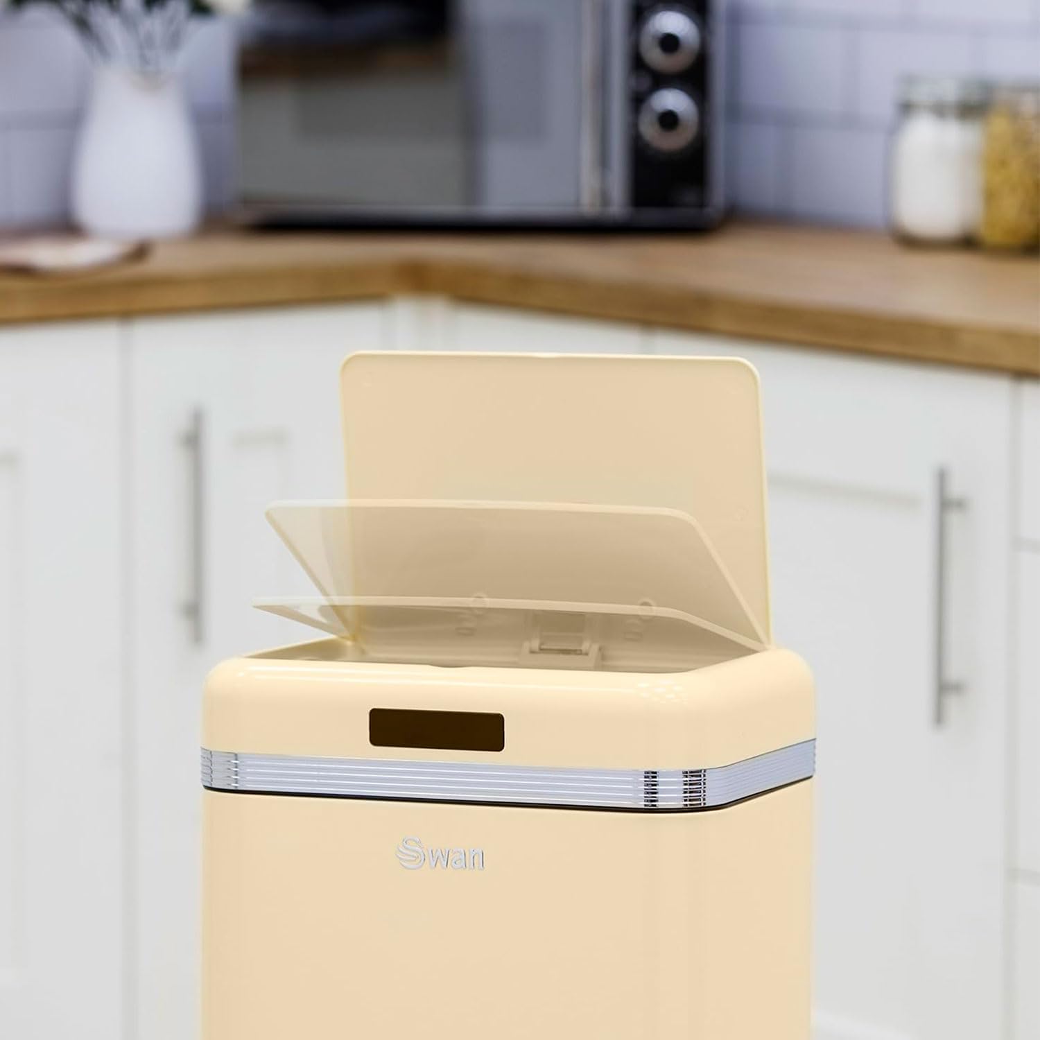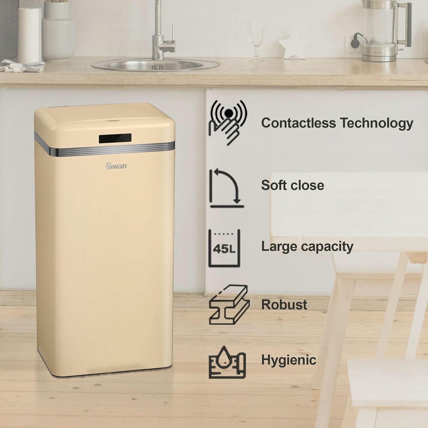 Cu un design retro si compact, impreuna cu senzorul inteligent, cosul de gunoi de la Swan se potriveste perfect in casa ta, oferind un aer chic. Cosul poate fi utilizat de la o distanta de pana la 15 cm iar inchiderea are loc automat.