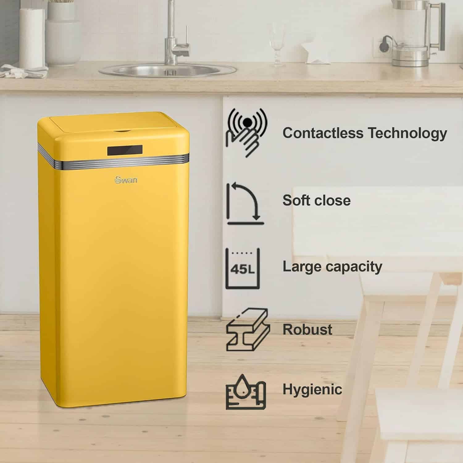 Cu un design retro si compact, impreuna cu senzorul inteligent, cosul de gunoi de la Swan se potriveste perfect in casa ta, oferind un aer chic. Cosul poate fi utilizat de la o distanta de pana la 15 cm iar inchiderea are loc automat.