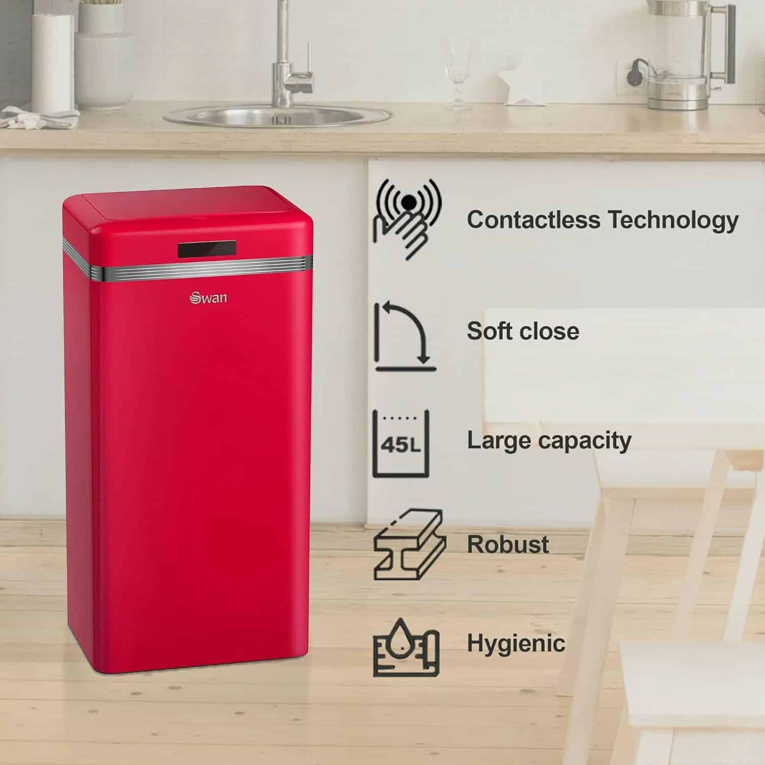 Cu un design retro si compact, impreuna cu senzorul inteligent, cosul de gunoi de la Swan se potriveste perfect in casa ta, oferind un aer chic. Cosul poate fi utilizat de la o distanta de pana la 15 cm iar inchiderea are loc automat.