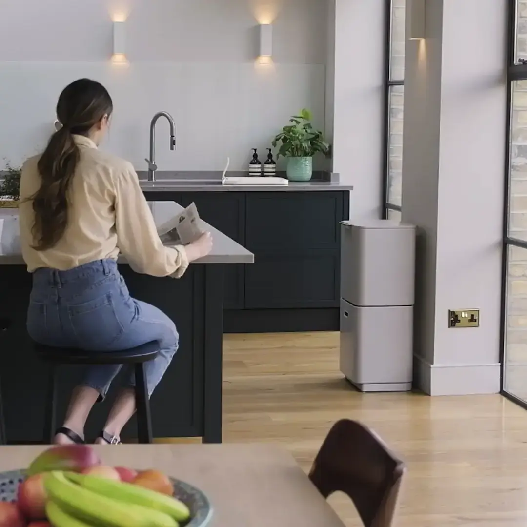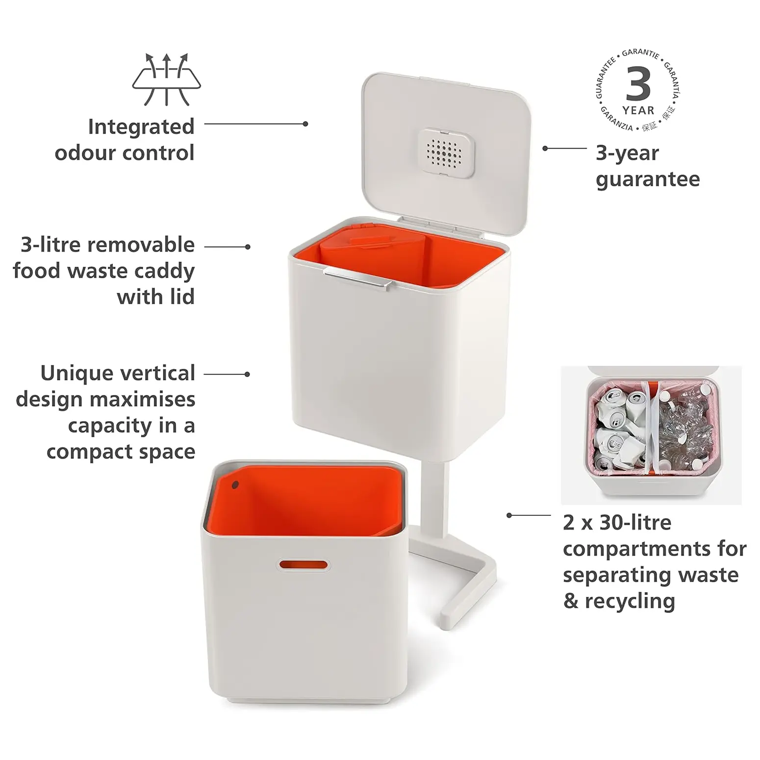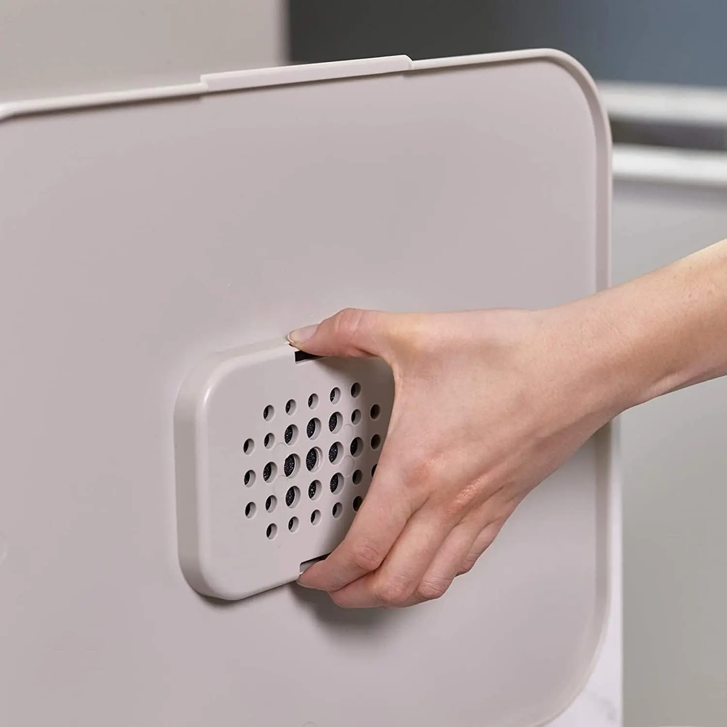Cosul de gunoi de la Joseph Joseph este potrivit pentru o bucatarie moderna. Cu un design minimalist si practic, cosul este dotat cu 2 compartimente, fiecare a cate 30 litri si un recipient de 3 litri pentru resturi alimentare.