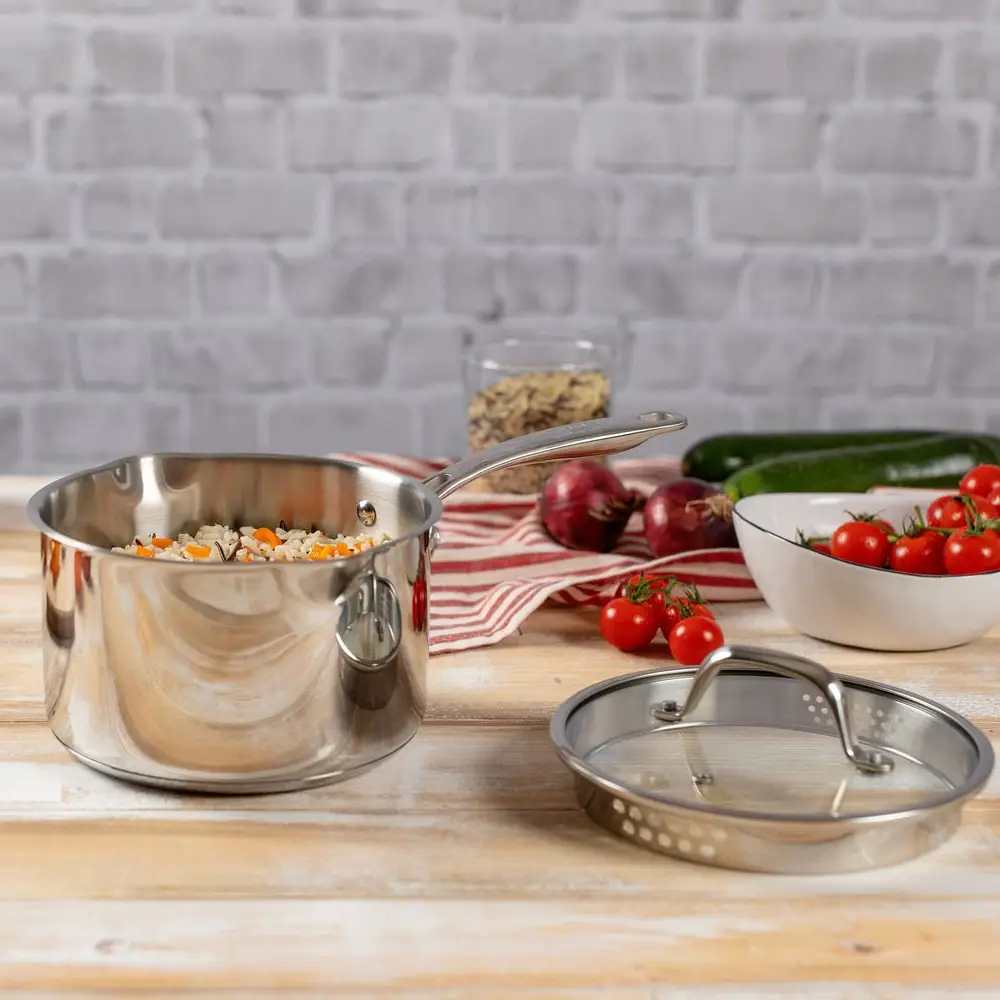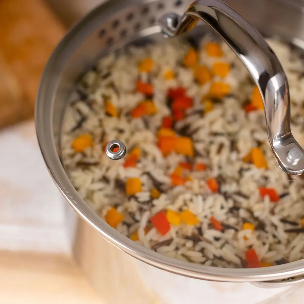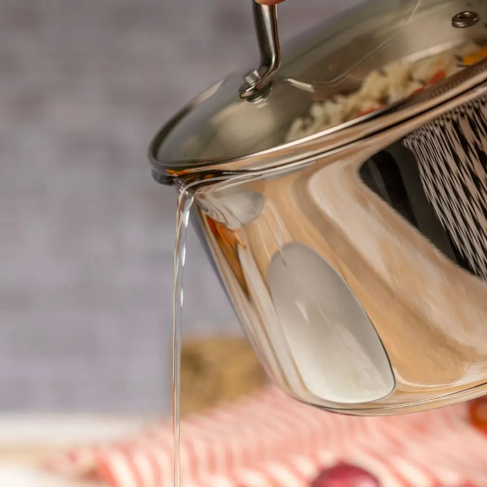 Cratita este dotata cu doua duze de scurgere, pentru a putea turna lichide confortabil, fie ca esti dreptaci sau stangaci! Mai mult, capacul dispune de margini perforate cu ajutorul carora poti strecura alimentele, de la cartofi la orez, fara griji si fara alte ustensile suplimentare.