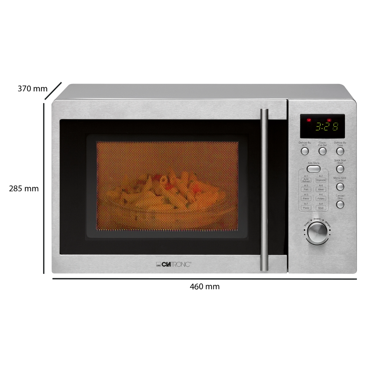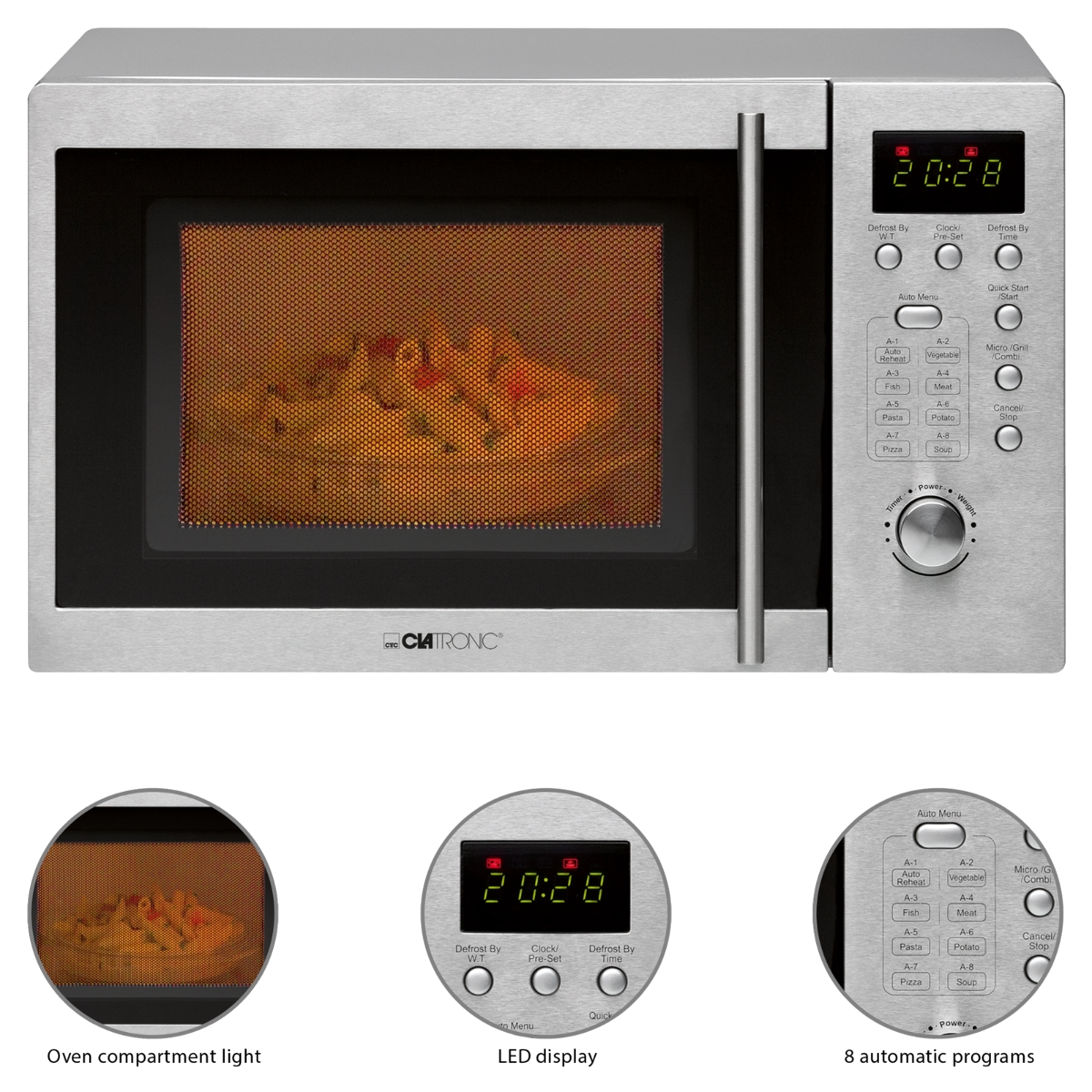 Cuptorul cu microunde este dotat cu 8 programe automate, dintre care 5 niveluri de incalzire, programul de dezghetare si programul grill (rumenire). Platoul din sticla, rotativ, are un diametru de 24.5 cm, perfect pentru orice fel vas compatibil cu cuptorul cu microunde.