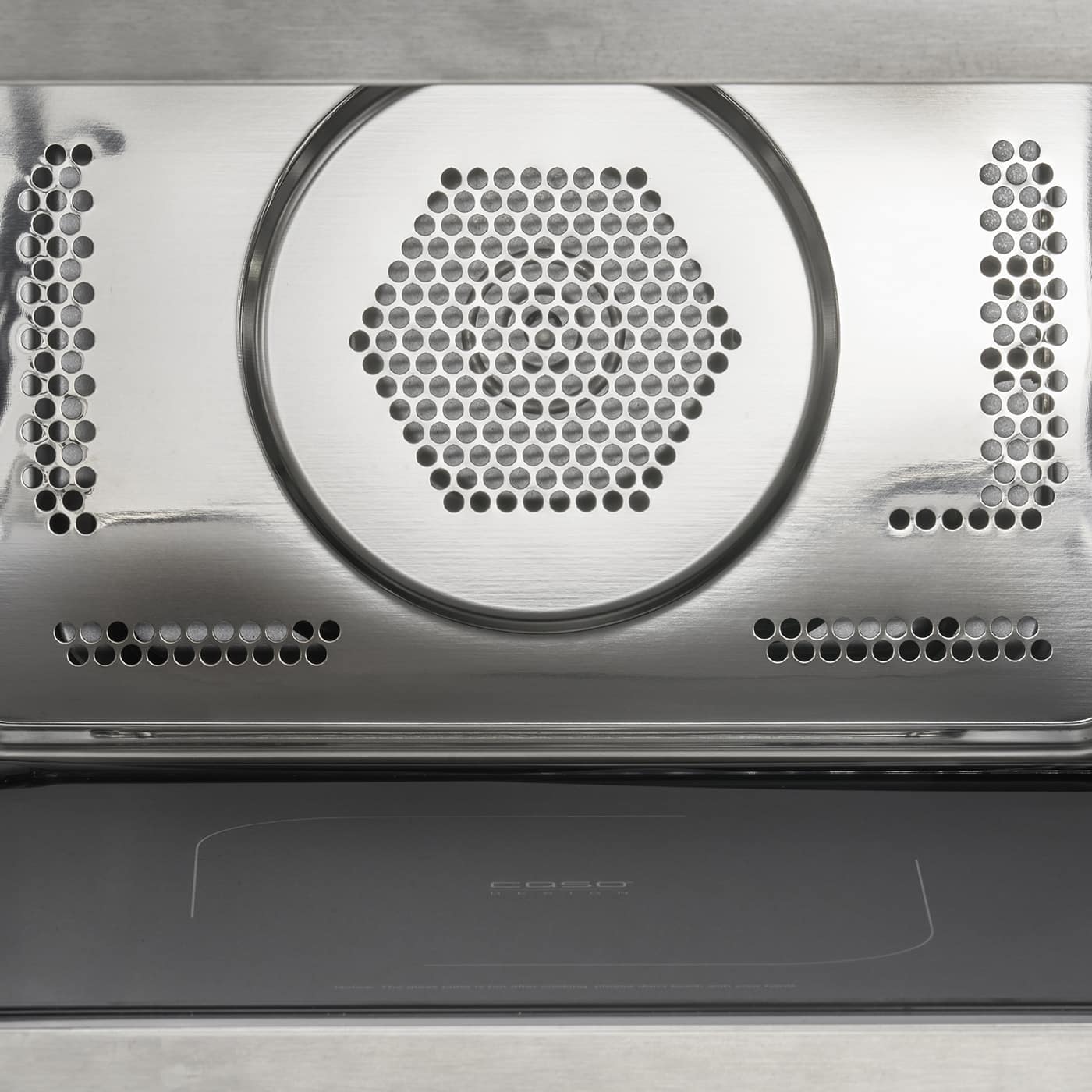 Cuptorul de la Caso Germany are o baza ceramica ce permite gatirea sau incalzirea in tavi sau caserole dreptunghiulare, oferind mai mult spatiu in comparatie cu modelele traditionale cu platou rotativ.