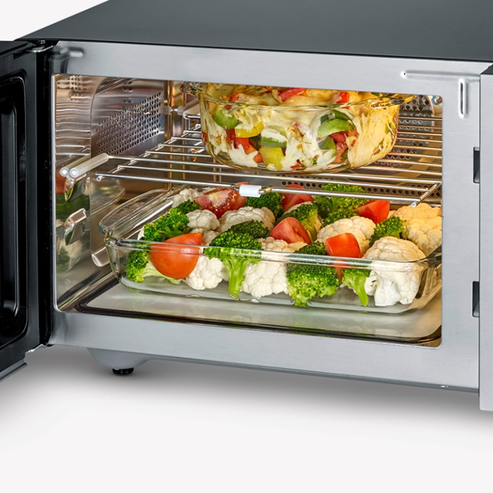 Cel il face deosebit fata de cuptoarele cu microunde traditionale este functia de gatire cu convectie (aer cald), astfel puteti prepara diferite feluri de mancare, de la paste, legume, musaca si multe altele.