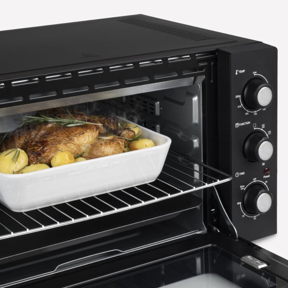 Acest cuptor dispune de 5 moduri de gatire si o temperatura ajustabila, astfel ca puteti gati orice, de la cartofi gratinati, placinte, pizza, friptura, briose pana la un pui intreg la rotisor.