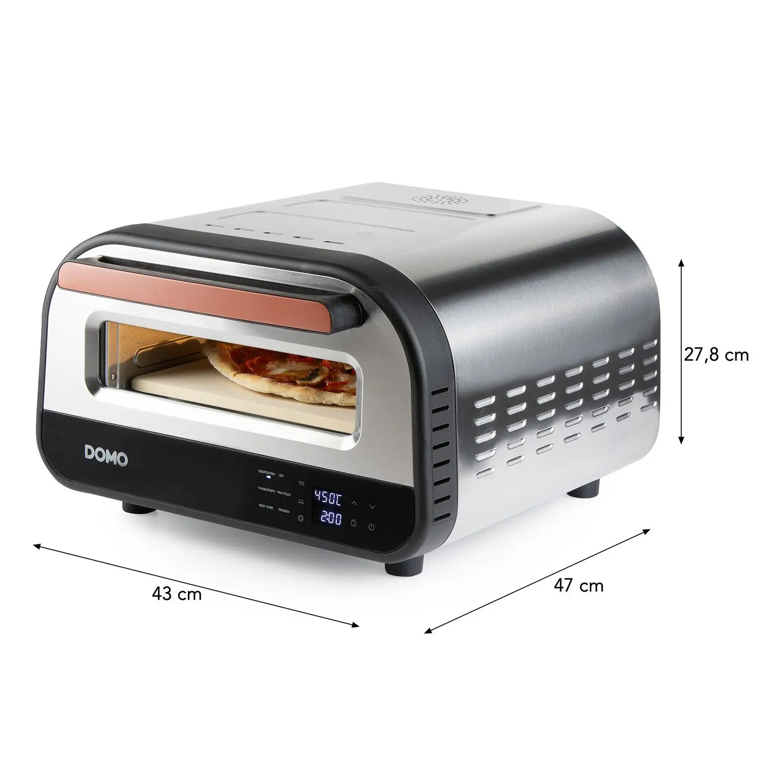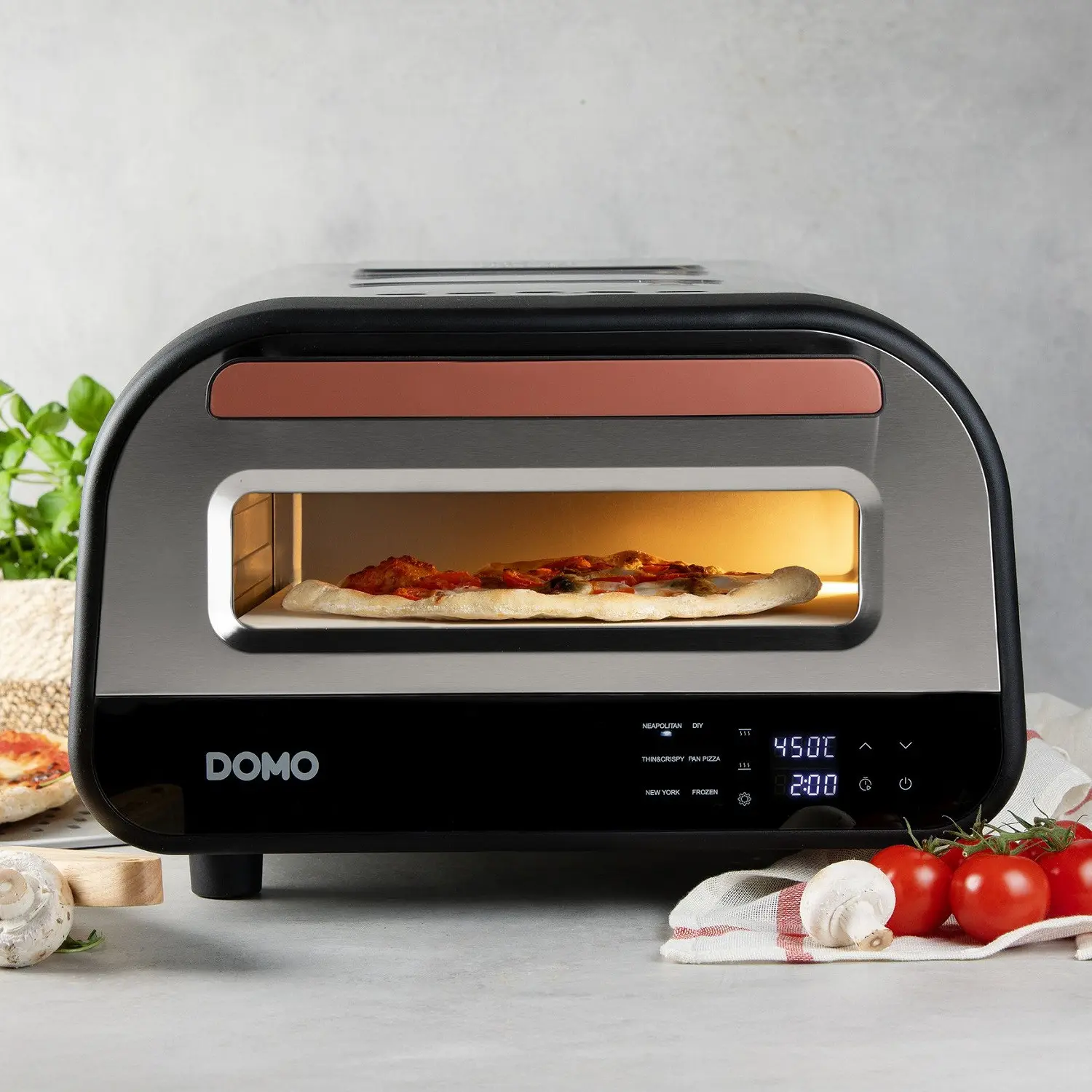 Cuptorul pentru pizza Pizza Genius, de la DOMO, are toate caracteristicile necesare pentru a crea pizza ca in Italia, datorita placii sale antiaderenta. Cu acest cuptor, poti gati pizza proaspata sau chiar congelata de trei ori mai rapid decat intr-un cuptor traditional.