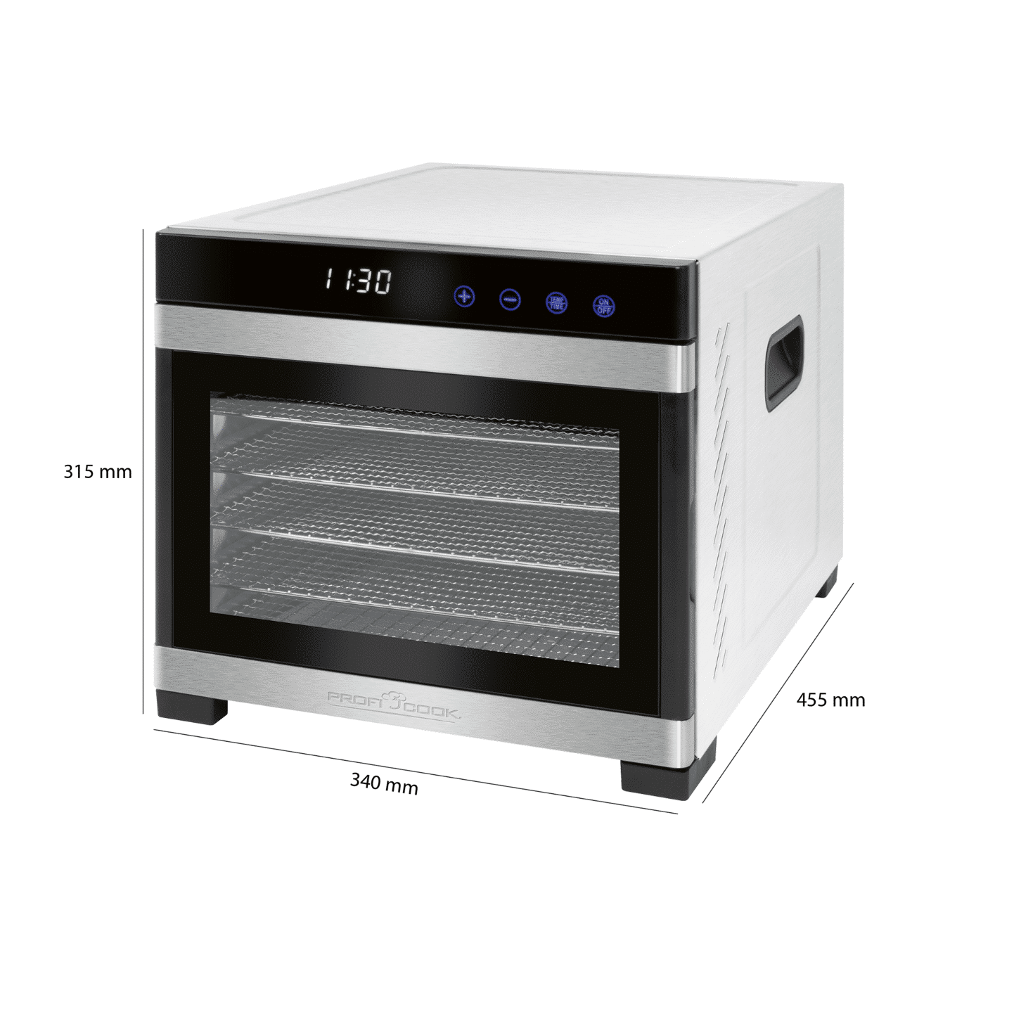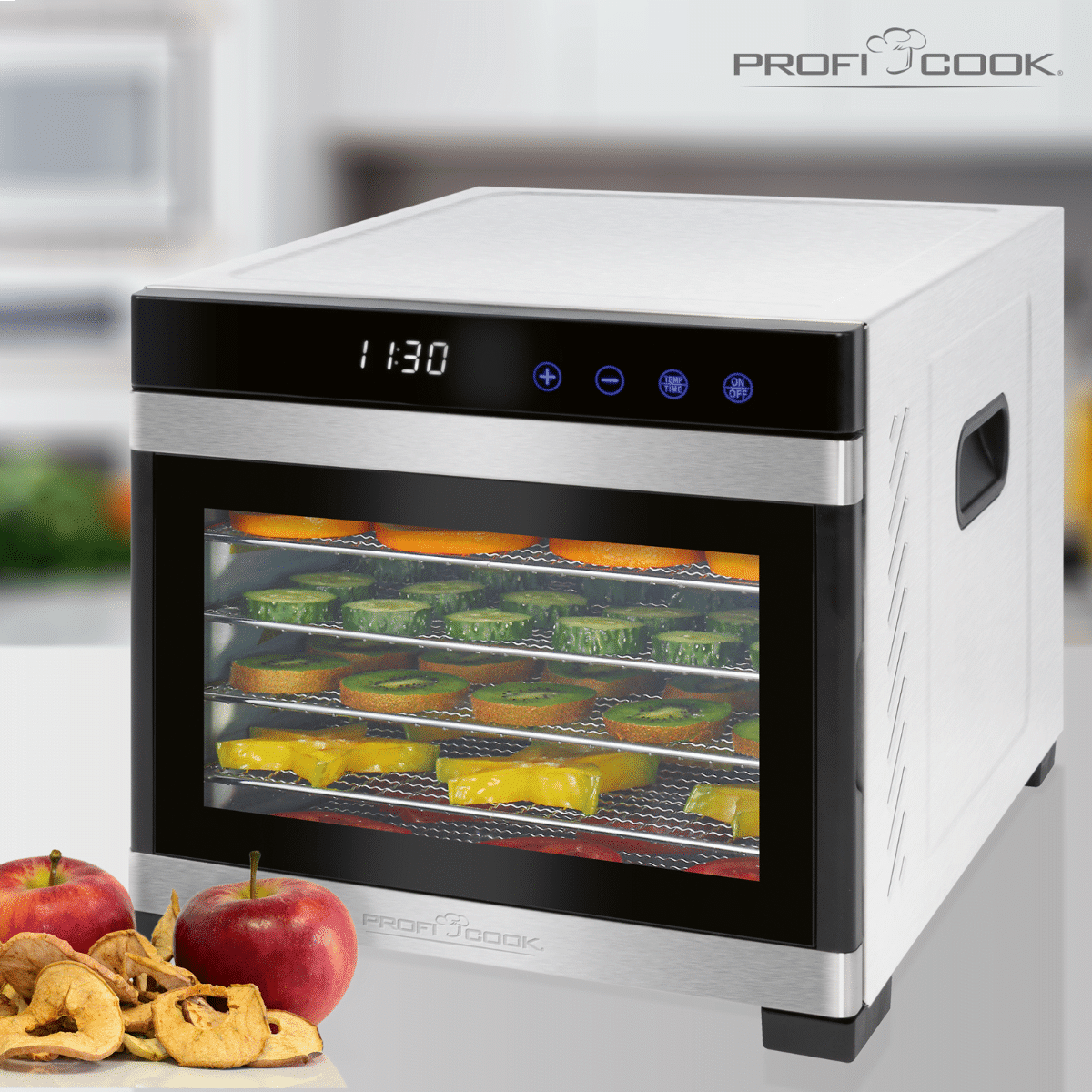 Deshidratorul PC-DR 1218 reduce continutul natural de apa pana la o anumita limita, fara a reduce valoarea nutritiva a alimentelor ce se deshidrateaza. Cu ajutorul display-ului LED cu senzor tactil puteti seta temperatura dorita in functie de ce doriti sa deshidratati dar si timpul care variaza de la 30 minute pana la 24 ore.