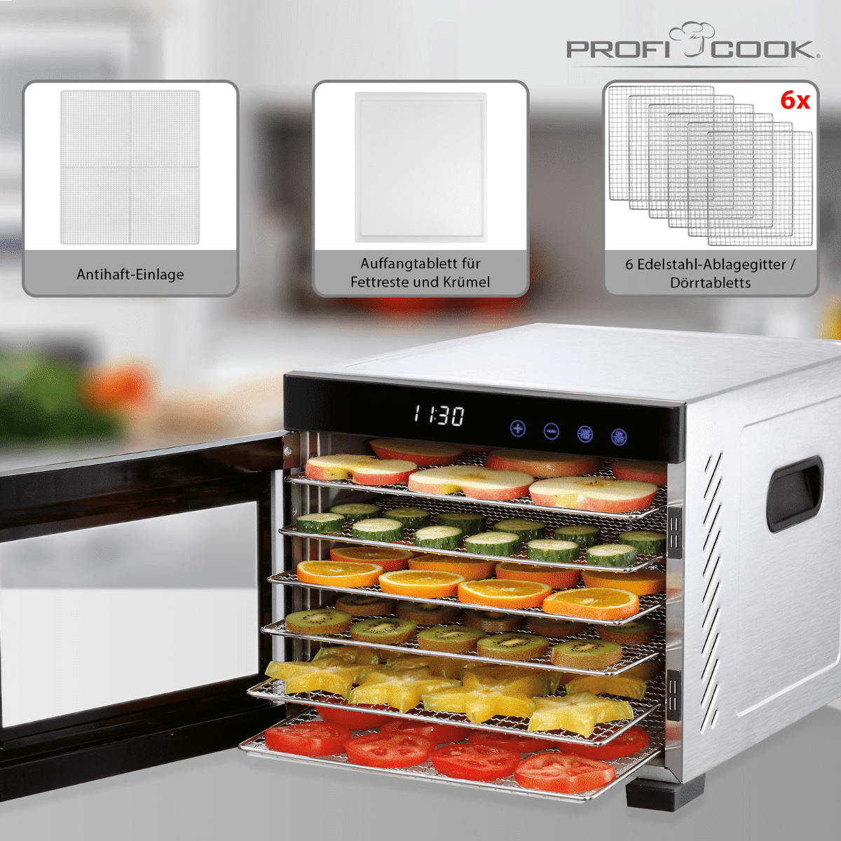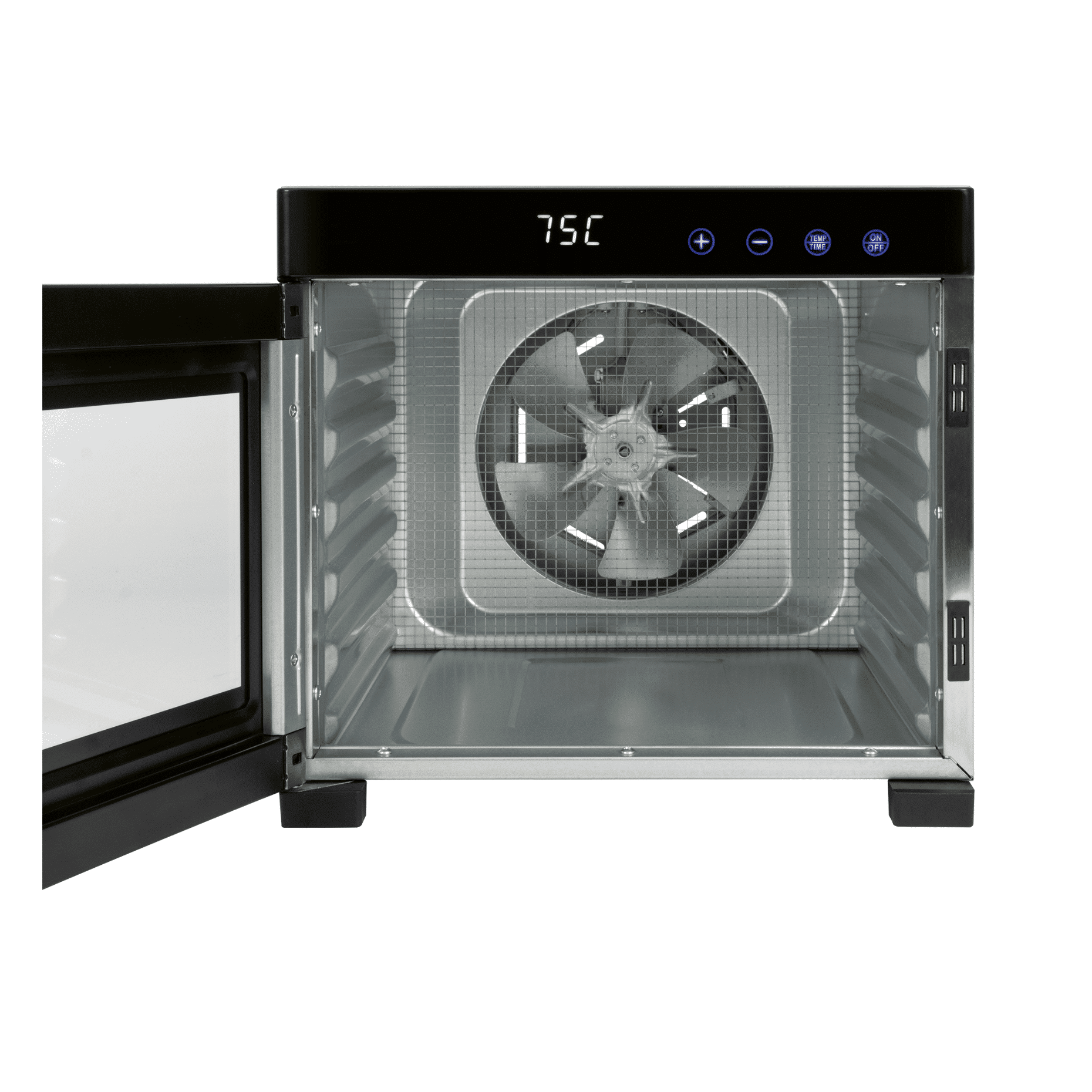 Puteti preparata gustarile preferate intr-un numar foarte mare datorita celor 6 tavi incapatoare din otel inoxidabil. Multumita distribuirii uniforme a caldurii si a termostatului digital alimentele vor fi deshidratate uniform, proces ce il puteti observa prin usa din sticla rezistenta la caldura.