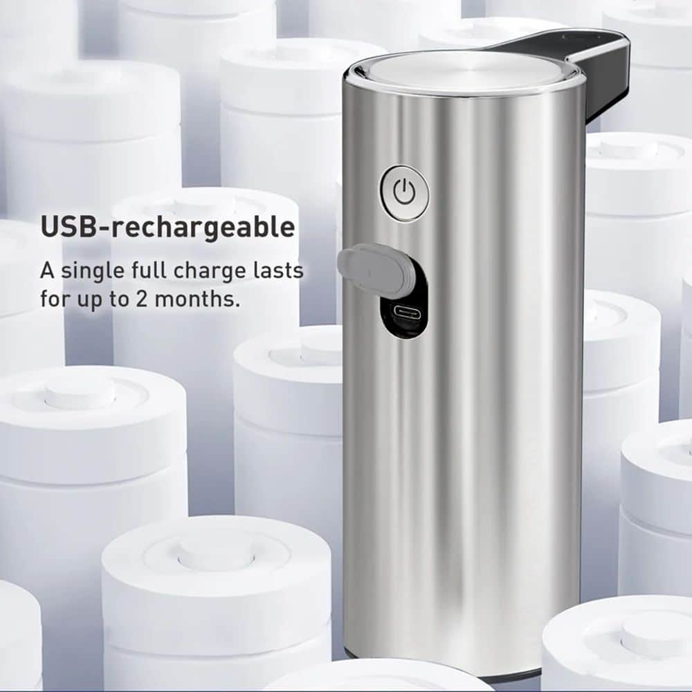 Dispenserul este prevazut cu un sistem de reincarcare la USB, ceea ce inseamna ca nu va fi nevoie sa inlocuiti bateriile in mod constant. Pur si simplu conectati-l la un port USB si se va incarca rapid si usor. Un alt aspect util este capacul cu sistem de deschidere tip pop-up – doar apasati pe capac iar acesta se va ridica, putand sa-l indepartati usor, oferindu-va un acces rapid si fara efort la produsul de curatare.