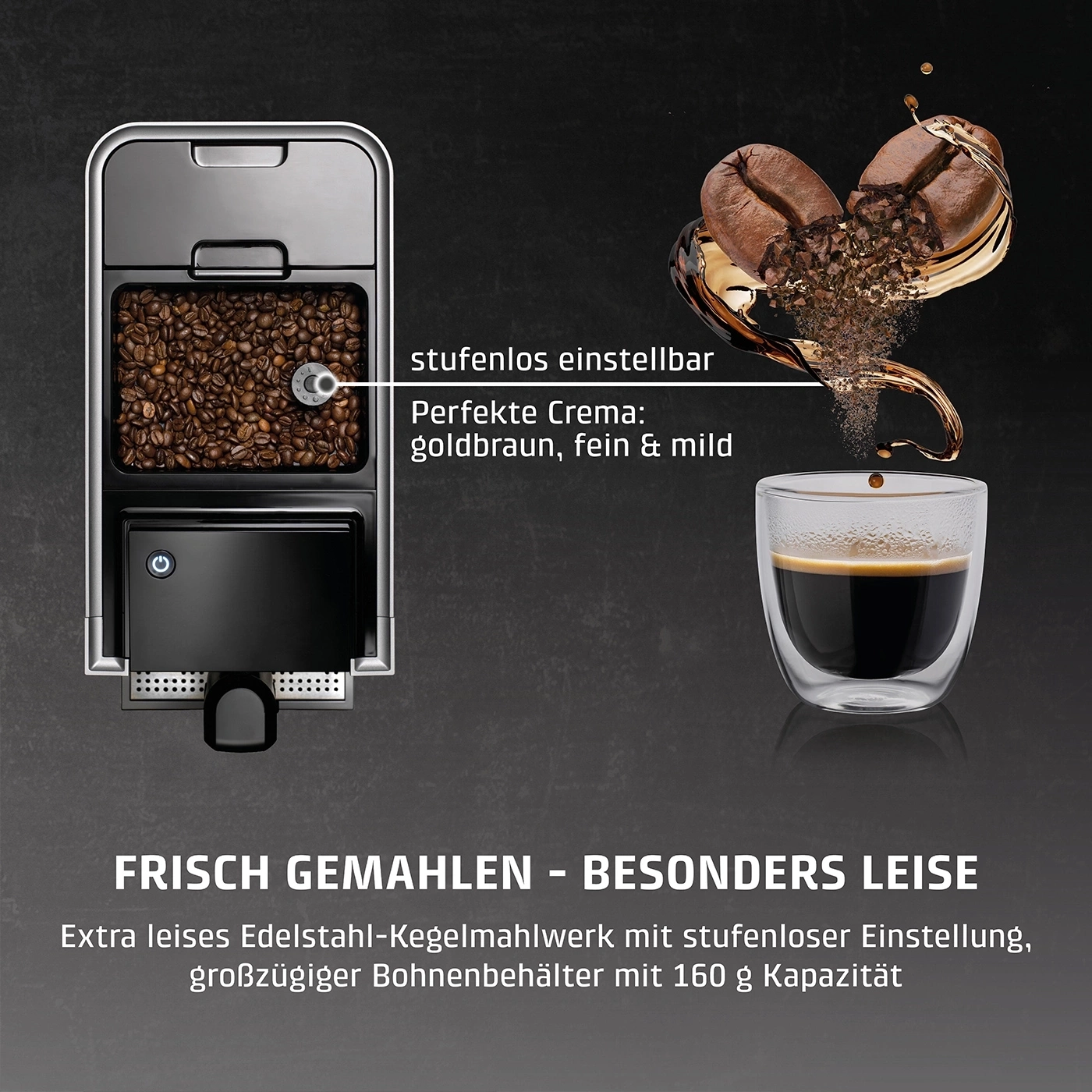 Datorita recipientului pentru boabe de 160 grame si a functiei de reglare a gradului de rasnire, cafeaua va fi intotdeauna proaspata si aromata.