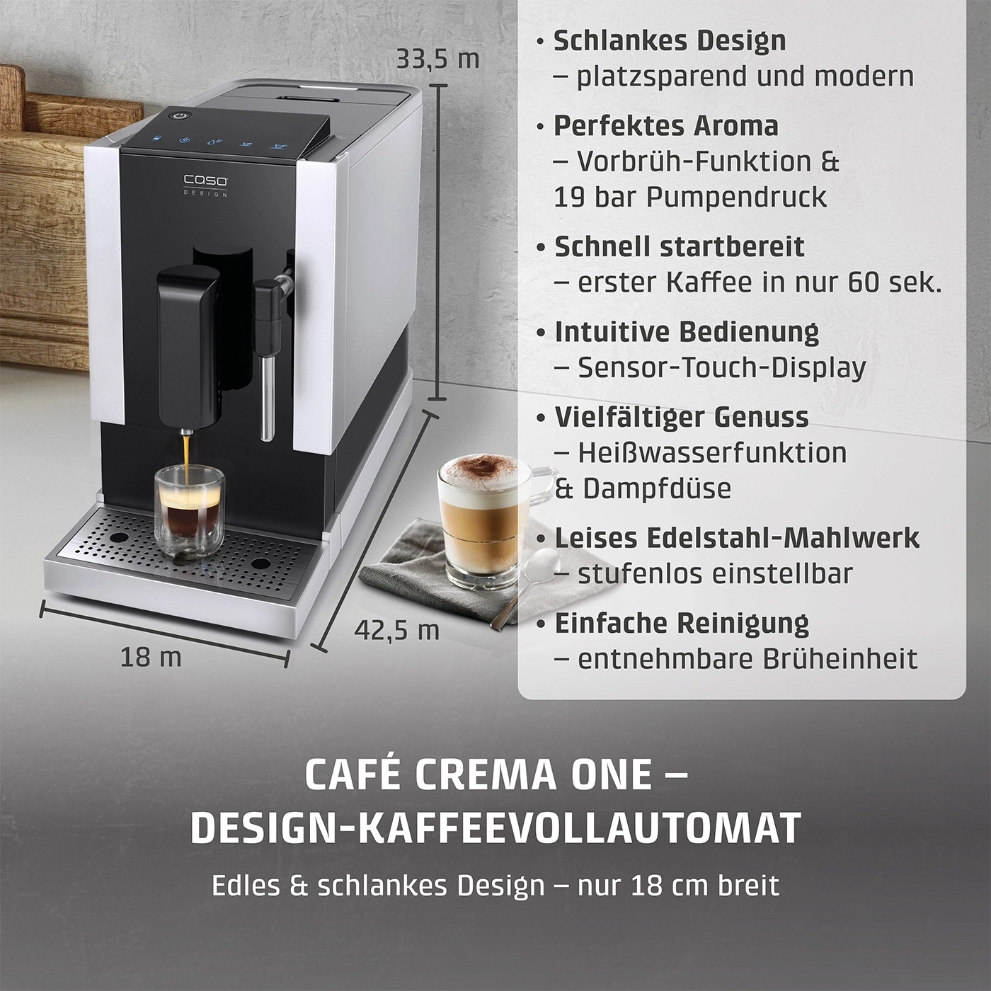 Cafe Crema One poate prepara o varietate de bauturi de cafea, printr-o singura atingere de buton! Espressorul automat prepara o varietate de bauturi, de la espresso, latte macchiato, pana la cappuccino. Mai mult, datorita functiei de apa calda, poti prepara ciocolata calda sau ceai.