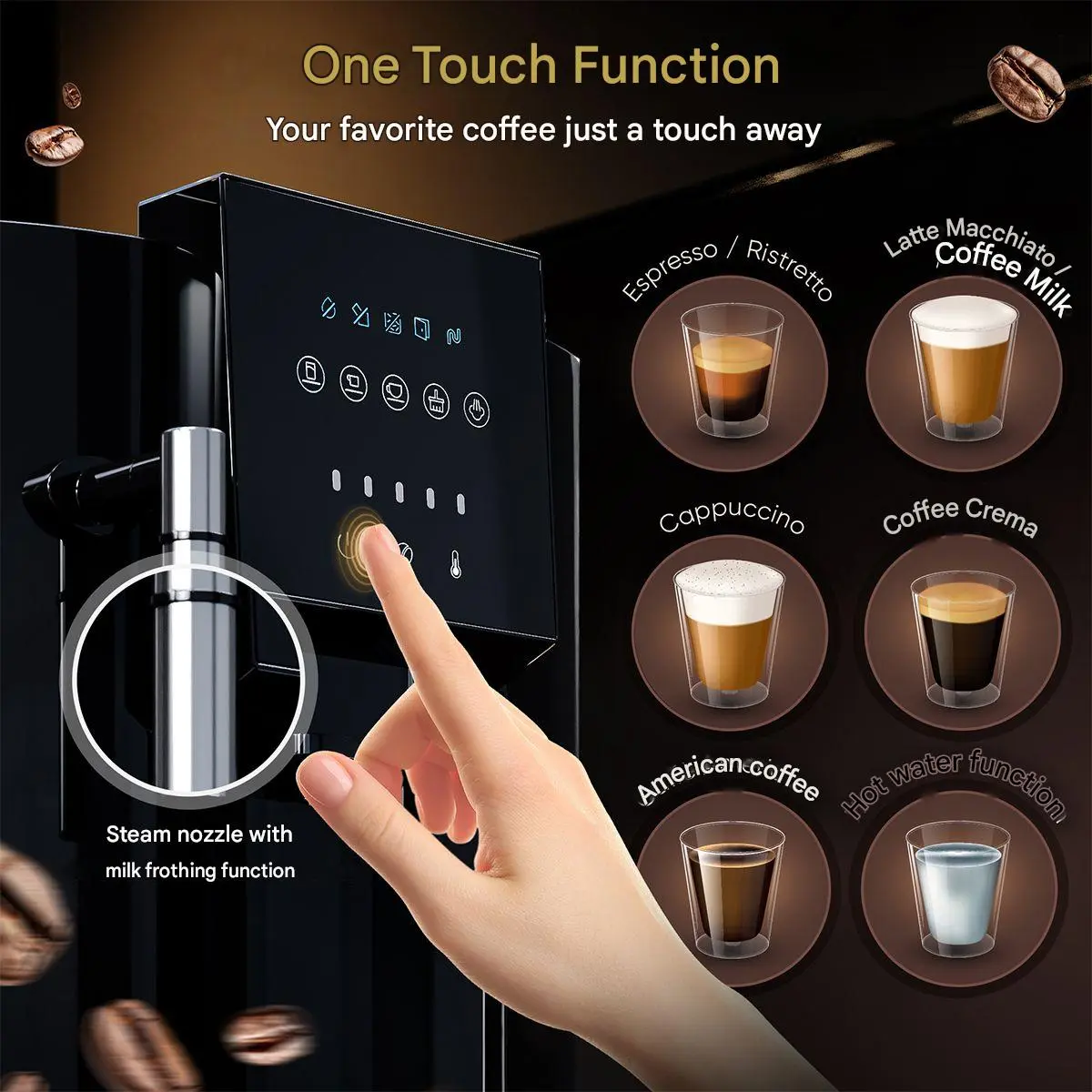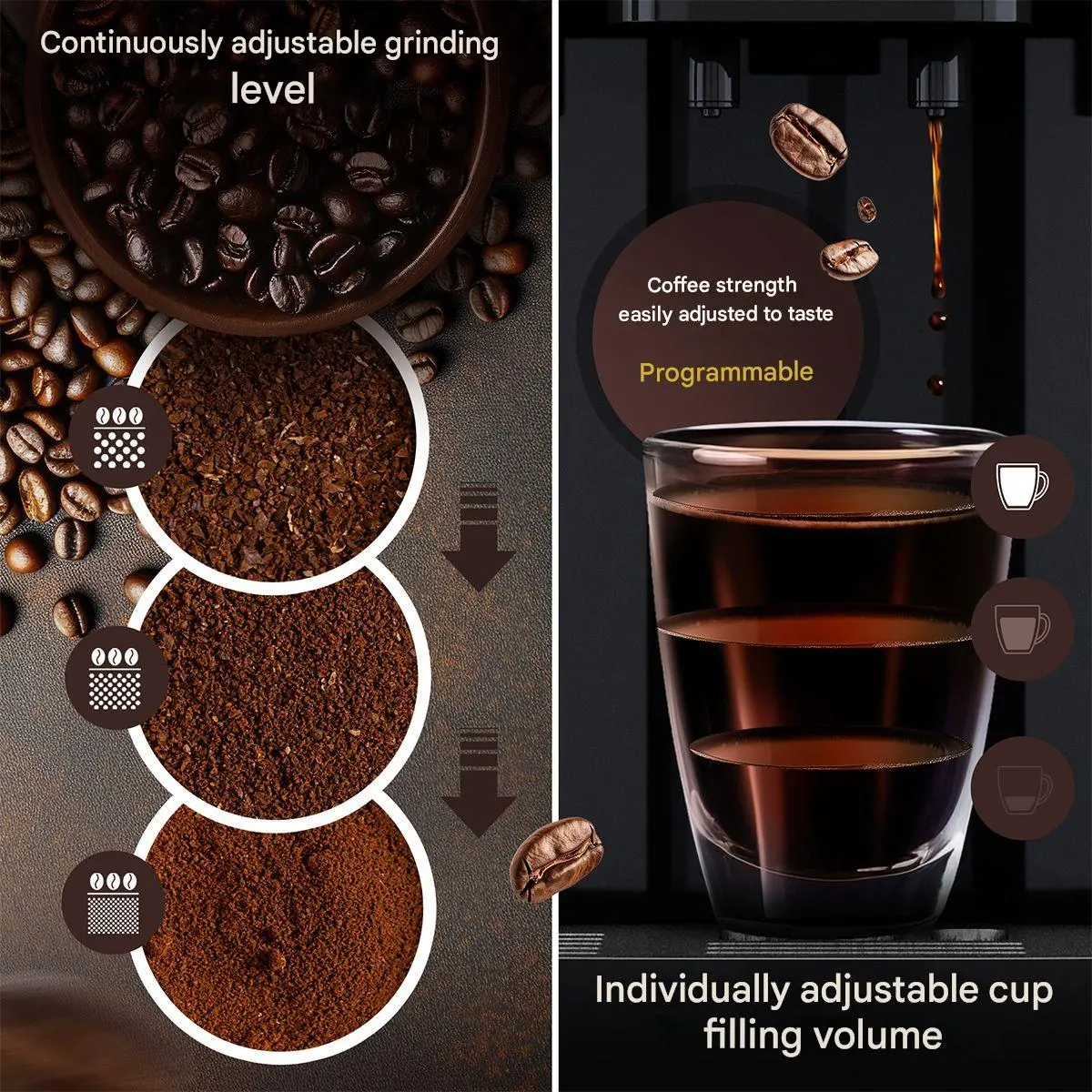 Rasnita integrata poate fi reglata dupa preferinte si iti asigura o cafea fresh! Mai mult, iti poti seta intensitatea si cantitatea de cafea. In cazul in care aparatul ramane fara cafea/apa sau are nevoie de curatare, te va anunta afisand un mesaj pe ecranul digital.