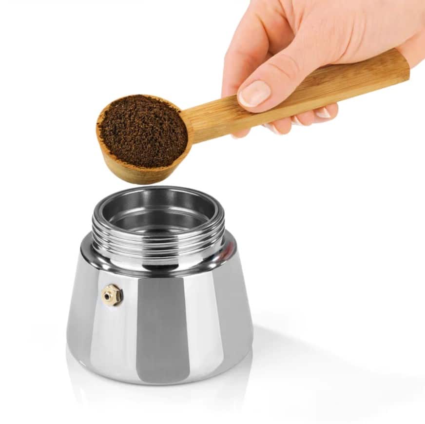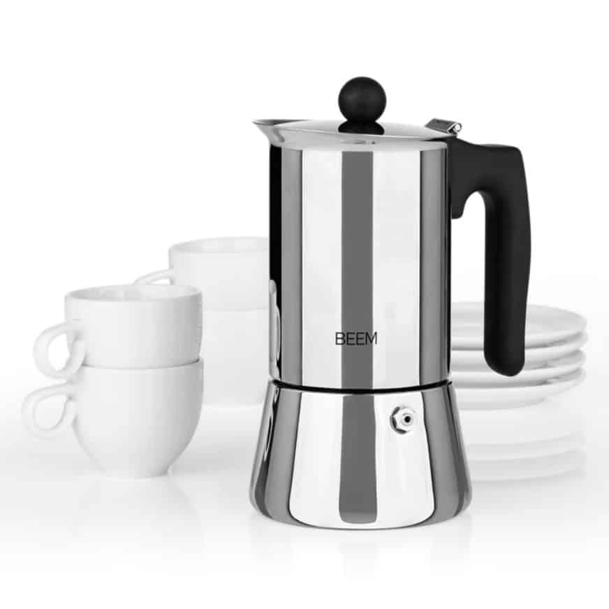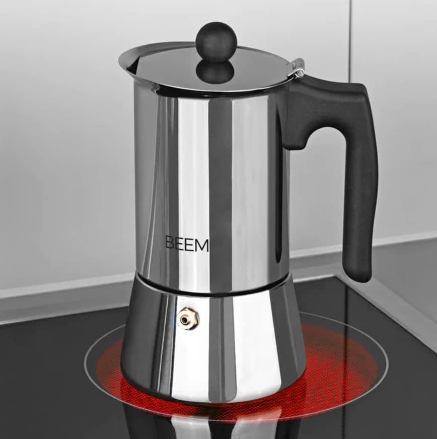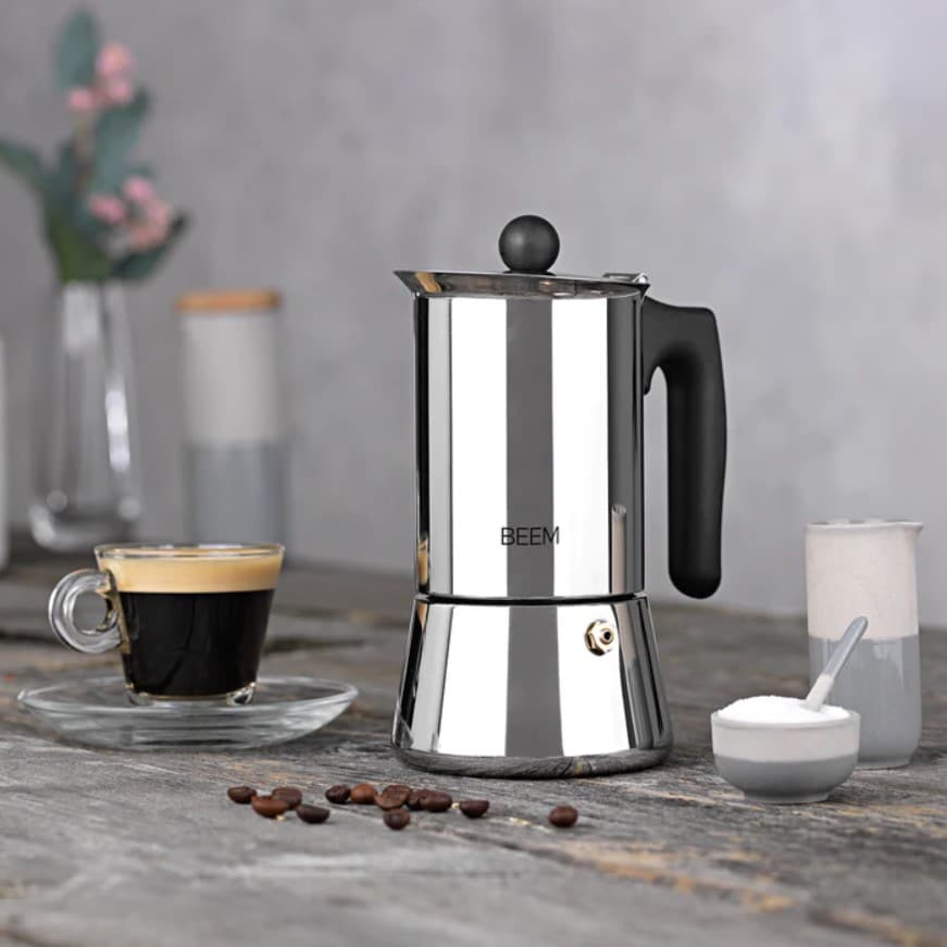 Espressorul de aragaz Espresso Maker, de la brandul german BEEM, este o versiune contemporana a vasului moka italian clasic. Cu ajutorul acestui produs puteti obtine cafeaua perfecta intr-un mod foarte usor – se toarna apa in sectiunea de baza, se pune cafeaua macinata fin pentru espresso in filtrul superior si se pune espressorul pe aragaz. Pe masura ce apa fierbe, cafeaua se ridica in partea superioara a vasului – usor de preparat si delicios.