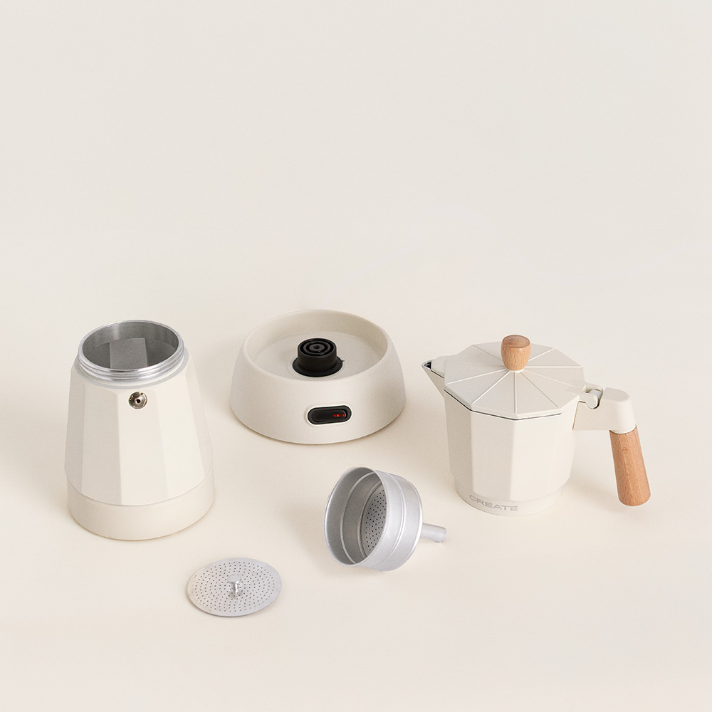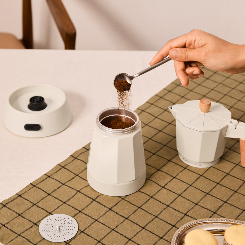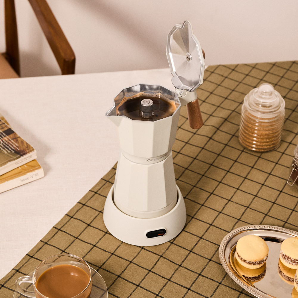 Espressorul moka pot electric, de la brandul spaniol CREATE, este o versiune contemporana a vasului moka italian clasic. Cu ajutorul acestui produs poti obtine cafeaua ideala intr-un mod foarte usor, eficient si sigur – doar toarna apa in sectiunea de baza, pune cafeaua macinata fin pentru espresso in filtrul superior, infileteaza cele doua parti si porneste aparatul.