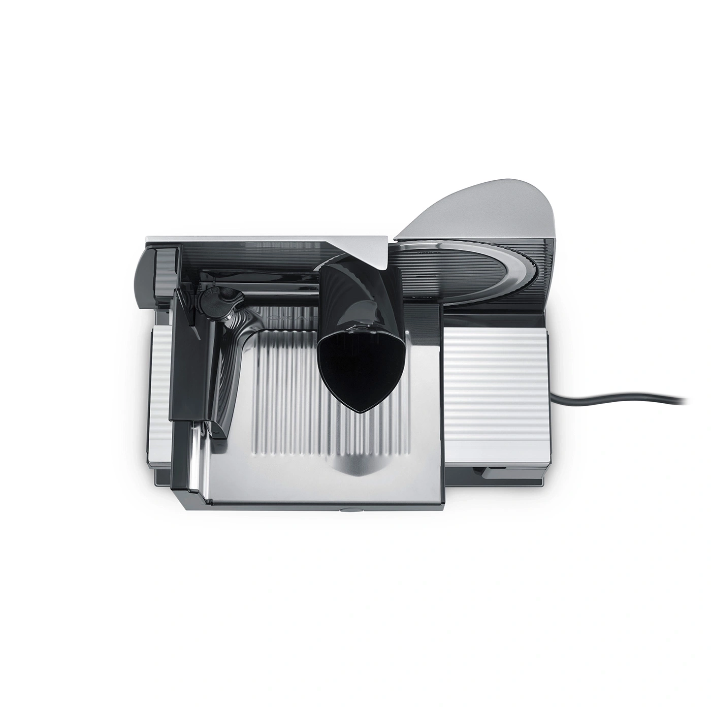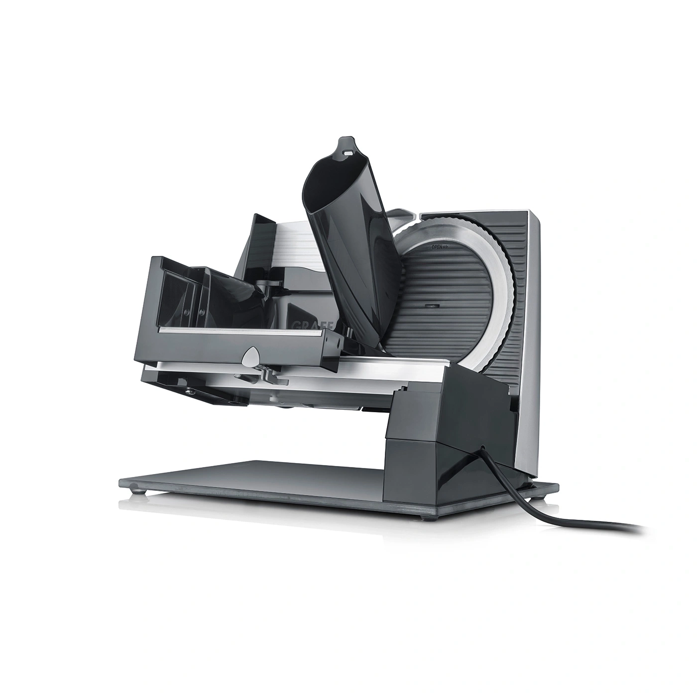 Siguranta atinge un alt nivel cu aparatele Graef. Acest feliator electric are o inclinatie de 15° ce elimina nevoia de a it apropia mana de lama ascutita a dispozitivului. Datorita structurii inclinate, produsele sun feliate si depozitate imediat in recipientul dorit, cu ajutorul gravitatiei.