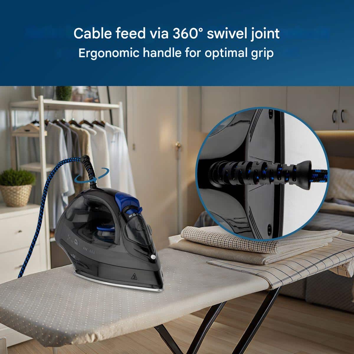 Puteti regla temperatura dispozitivului si intensitatea aburul (0-1-2-3). De asemenea, cablul are o articulatie pivotanta la 360° ceea ce permite o manevrare usoara a fierului pentru a ajunge in locurile greu accesibile precum manecile si gulerul. Mai mult, poate fi folosit rapid fara fir doar detasand baza cu fir!